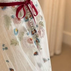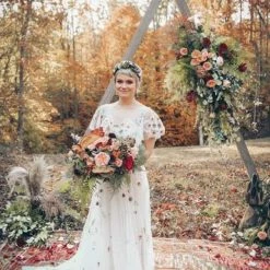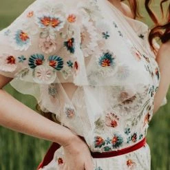 This gorgeous bridal gown inspired by modern folklore is crafted from Tillie Chantilly on soft netting. It features an illusion neckline, flutter sleeves, pearl buttons, and a velvet ribbon sash. Measures 61.5″ from shoulder to hem.