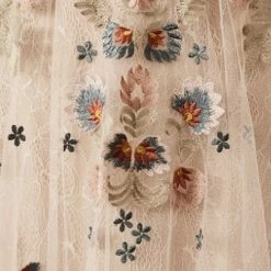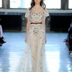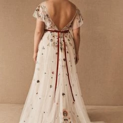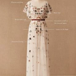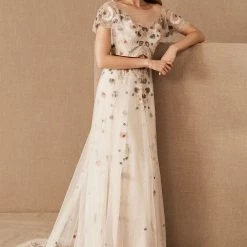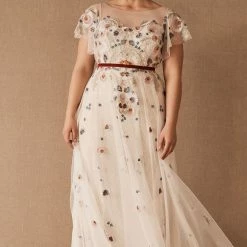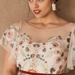 A scattering of floral embroidery and delicate flutter sleeves make this fit-and-flare gown a bohemian dream. Choose from timeless ivory embroidery or a rainbow of colorful blooms. By Willowby by Watters.