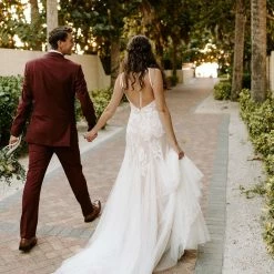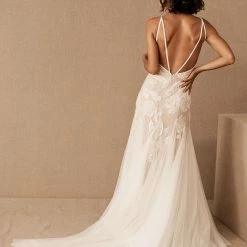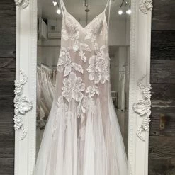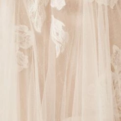 Slip into a strappy, slip-style dress with of oversized Pasteur lace and illusion tulle finished with a flourish of a chapel train. Dream come true? We thought so. Draped in oversized floral lace, this romantic slip dress features a flattering v-neckline and strappy, open back. A sweeping train made from airy tulle completes the look. By Willowby by Watters. Color: Ivory / Oyster