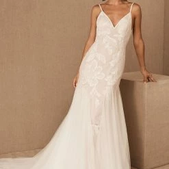 Slip into a strappy, slip-style dress with of oversized Pasteur lace and illusion tulle finished with a flourish of a chapel train. Dream come true? We thought so. Draped in oversized floral lace, this romantic slip dress features a flattering v-neckline and strappy, open back. A sweeping train made from airy tulle completes the look. By Willowby by Watters. Color: Ivory / Oyster