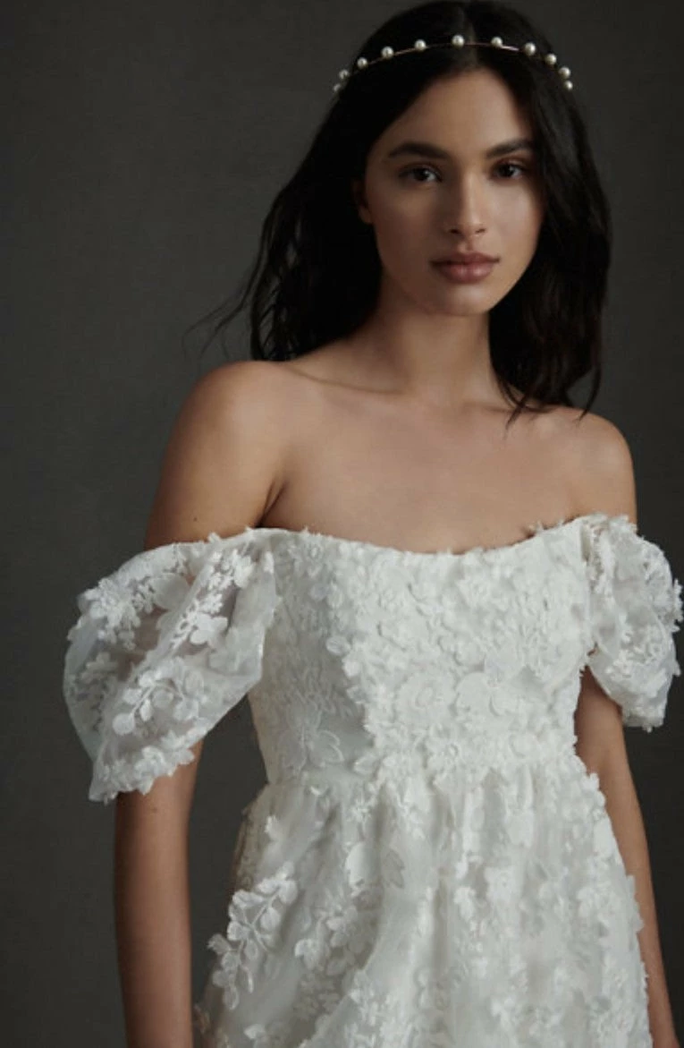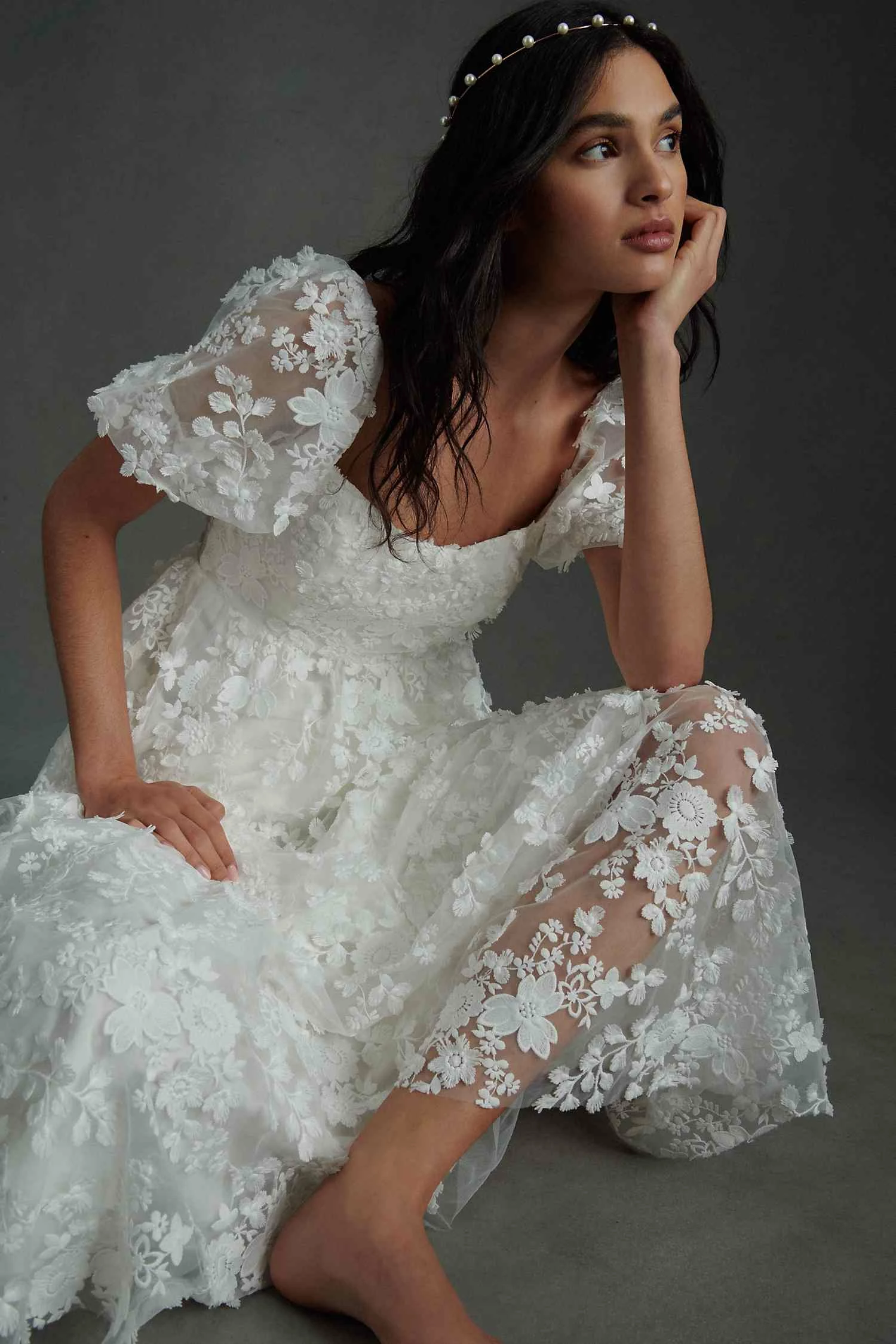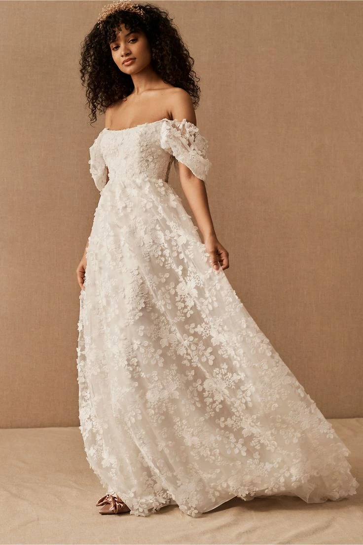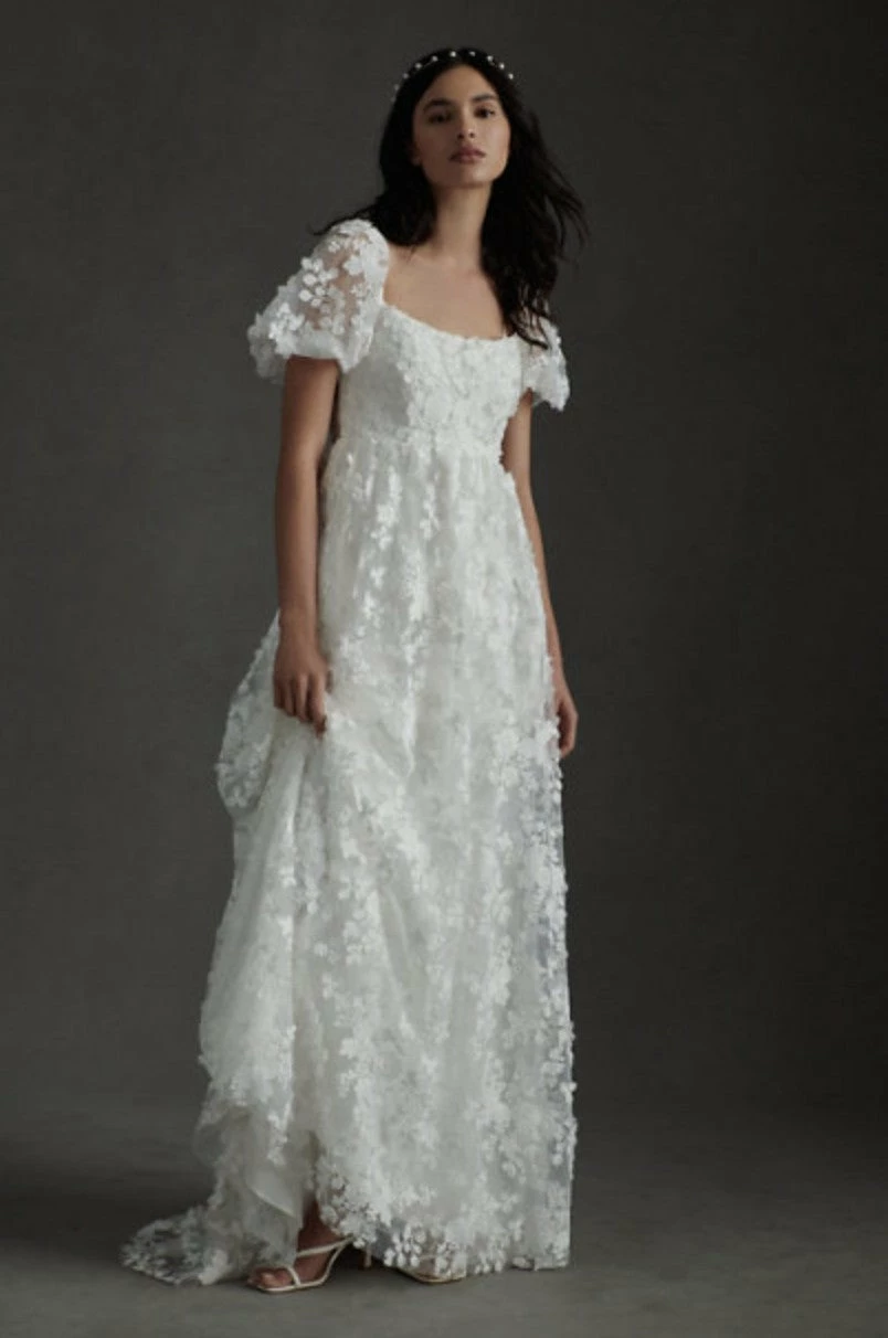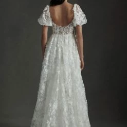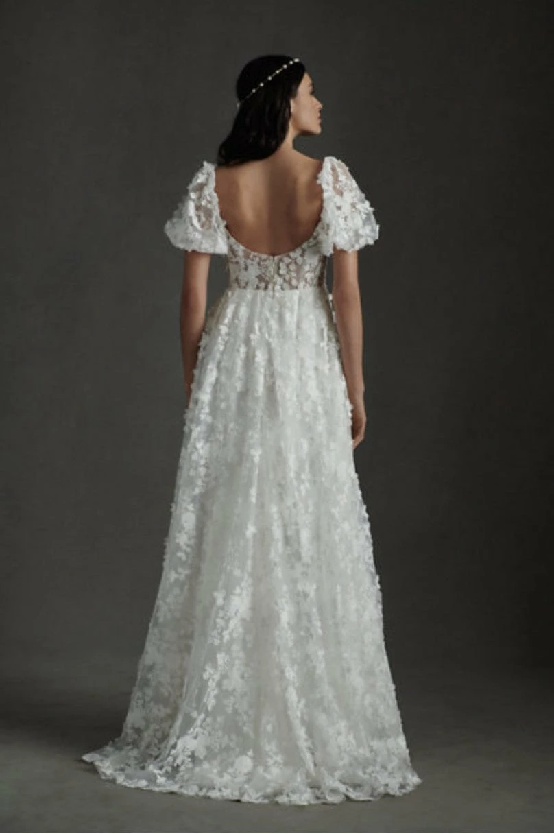 Delicate allover florals add alluring dimension to this romantic A-line gown. A sheer back shows off the intricate embroidery, while the puff sleeves can be worn on or off the shoulder. By Willowby by Watters.Â