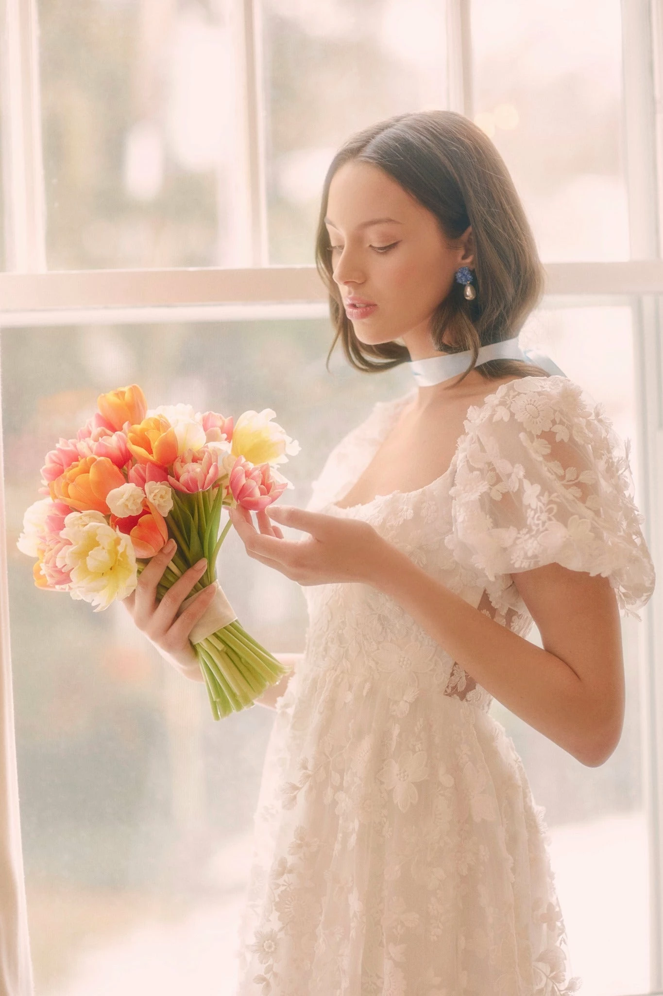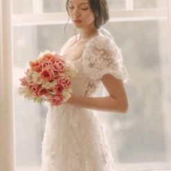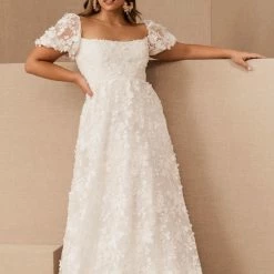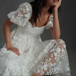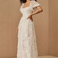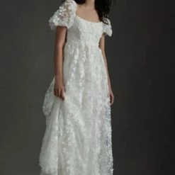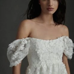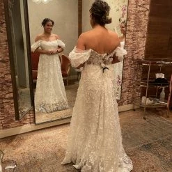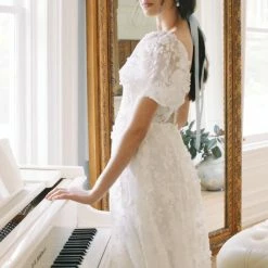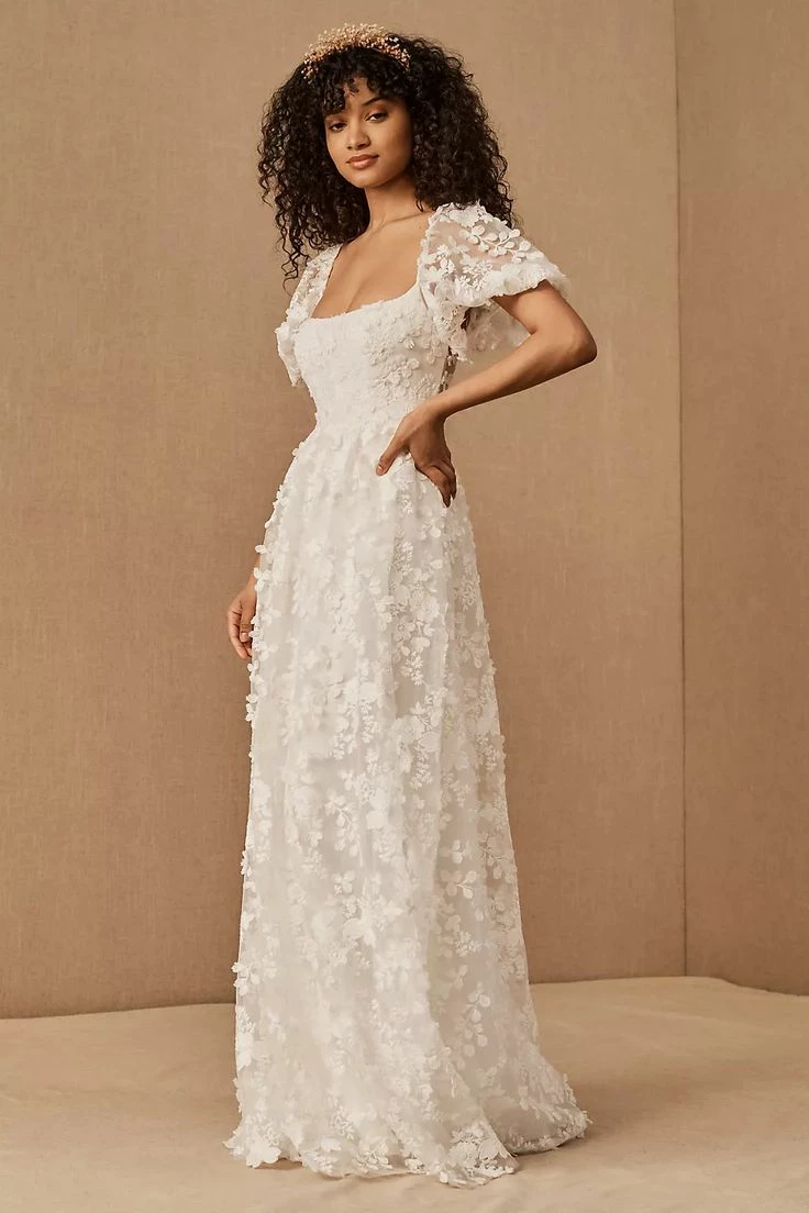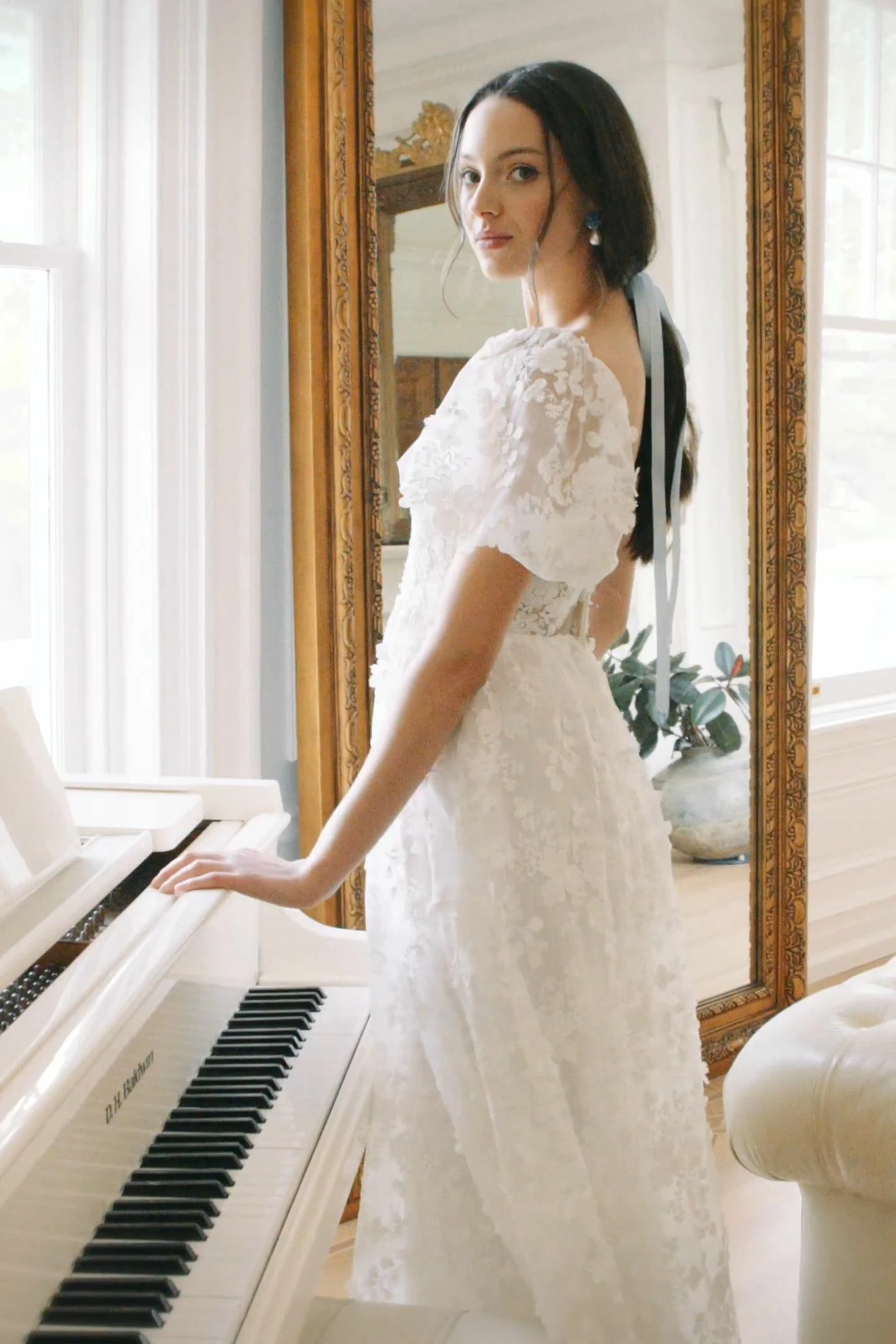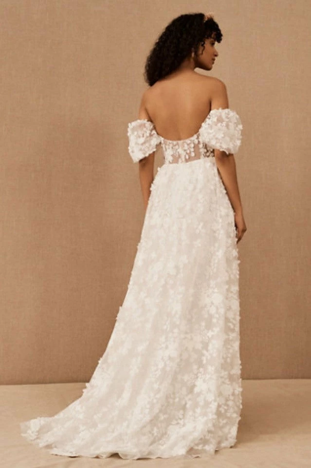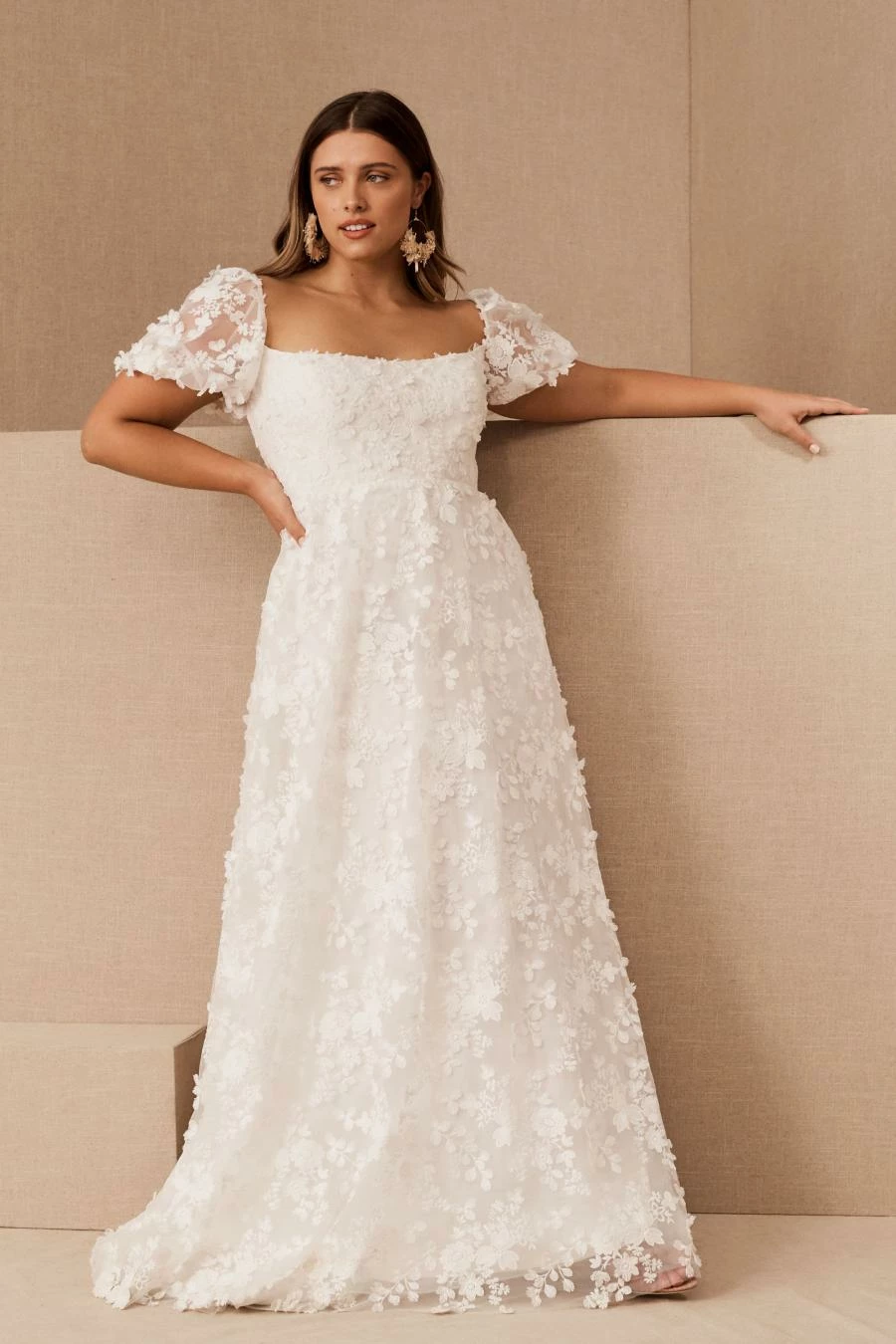 Delicate allover florals add alluring dimension to this romantic A-line gown. A sheer back shows off the intricate embroidery, while the puff sleeves can be worn on or off the shoulder. By Willowby by Watters.Â