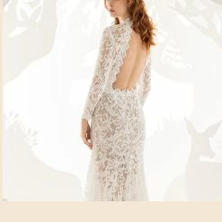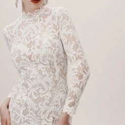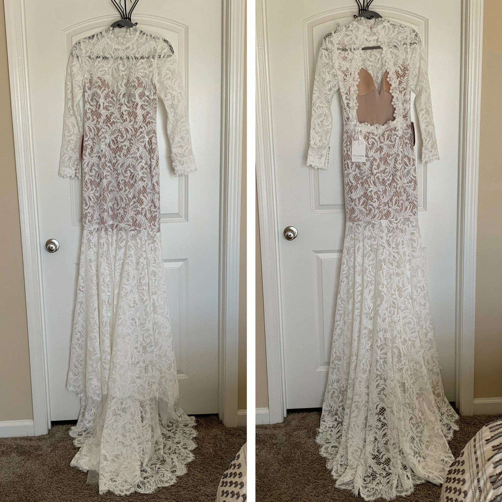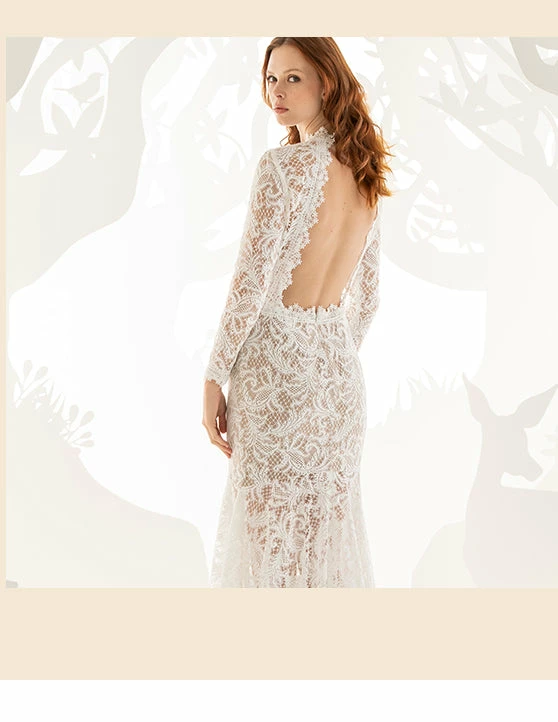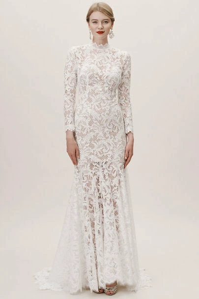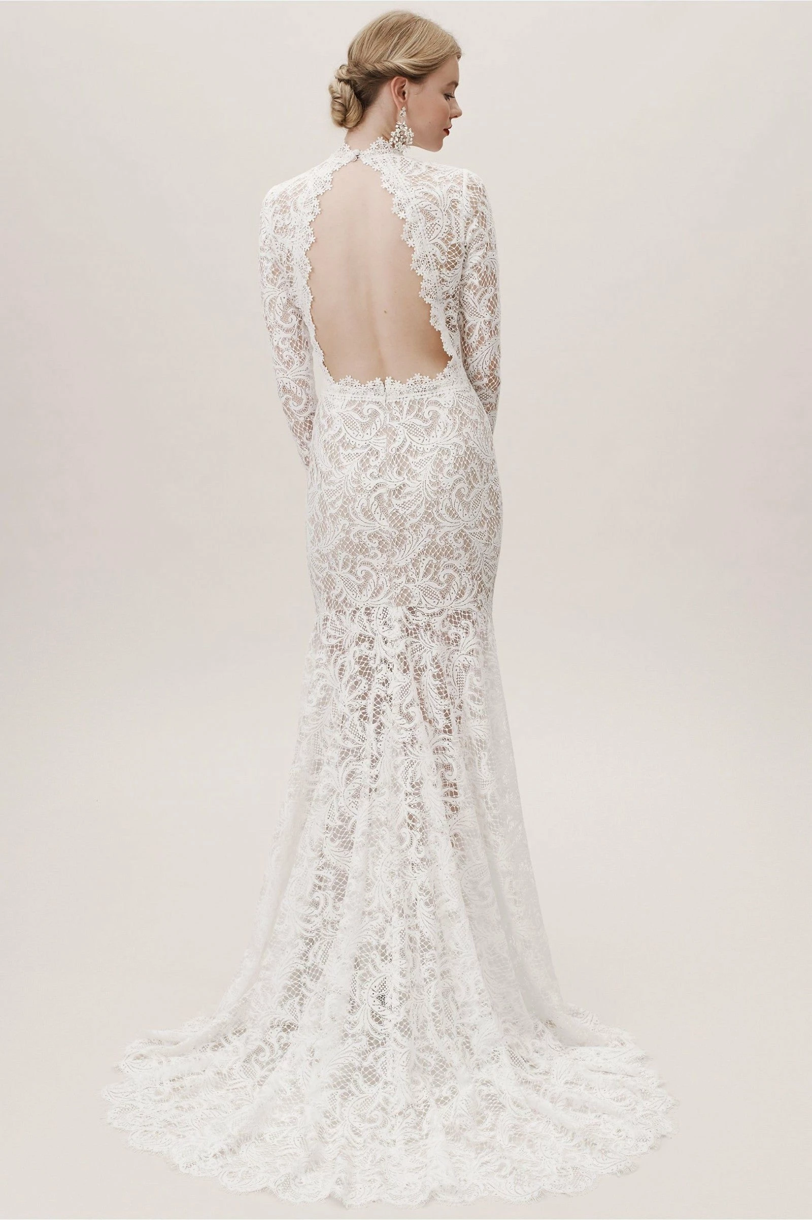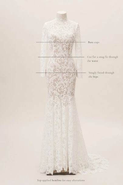A modern take on allover lace, this gown pairs a fashion-forward mock neck with long sleeves and an open back. Fitted throughout the bodice and hips, it kicks out into a sheer lace panel for an airy finish. By Willowby by Watters.