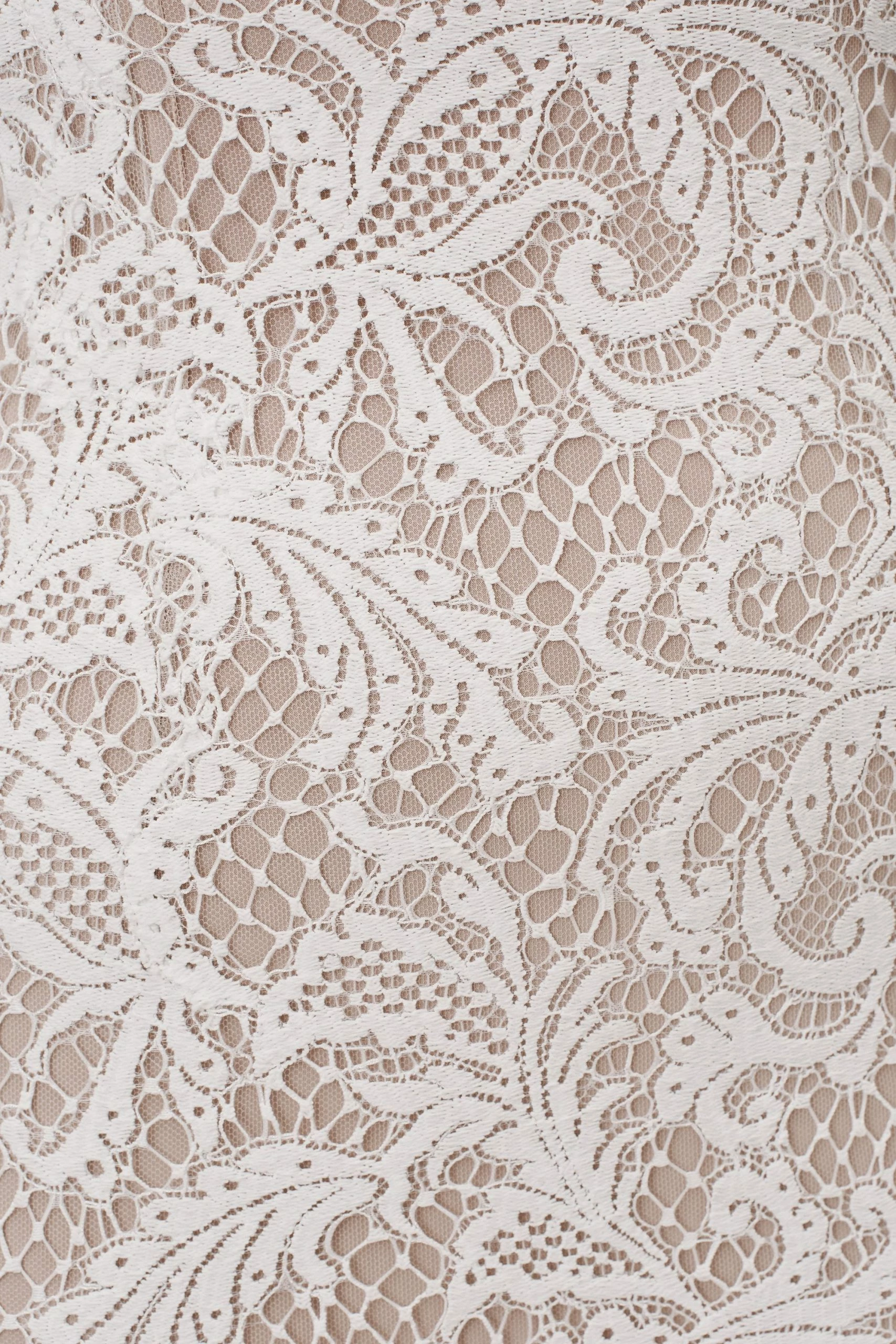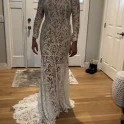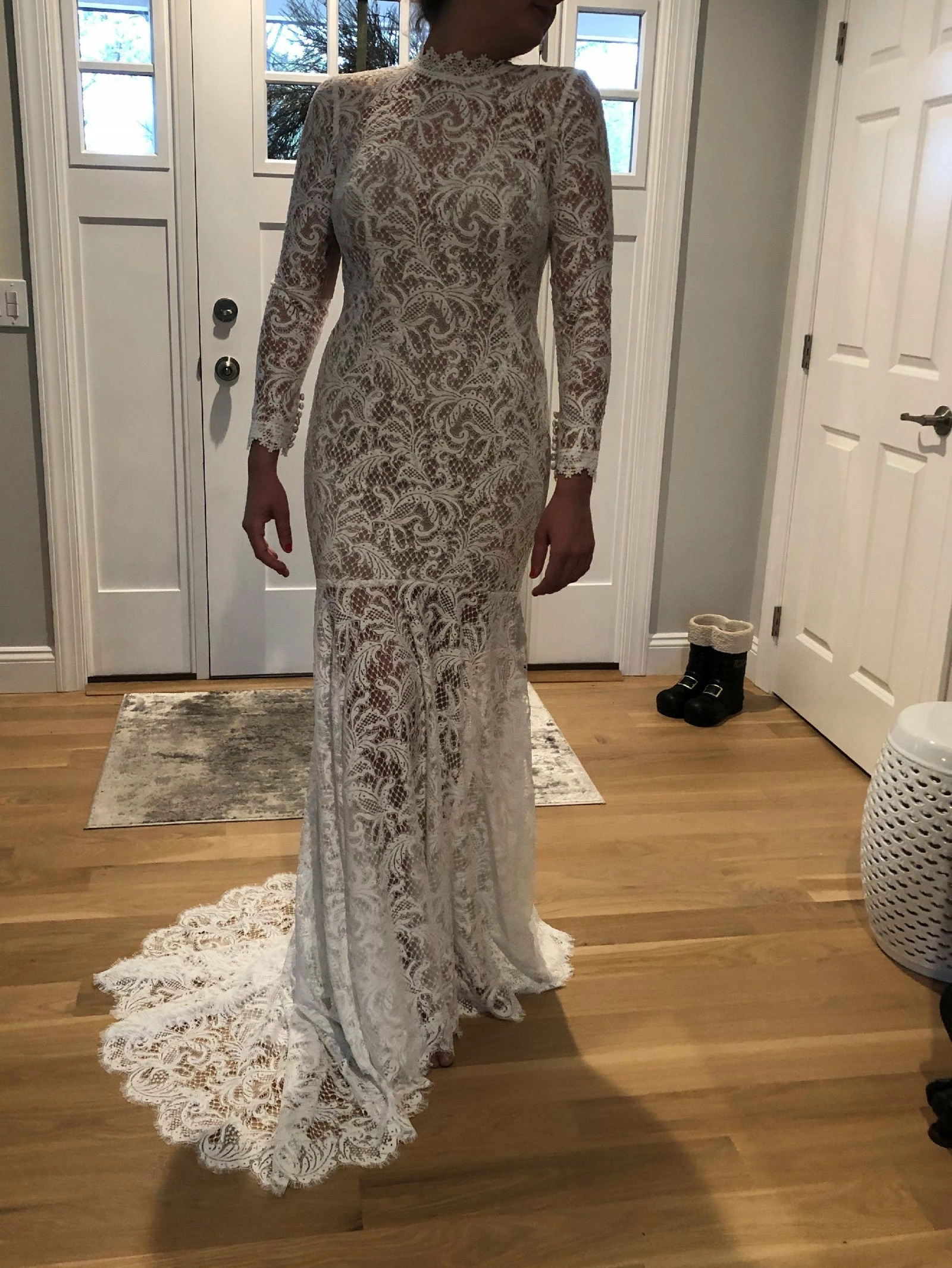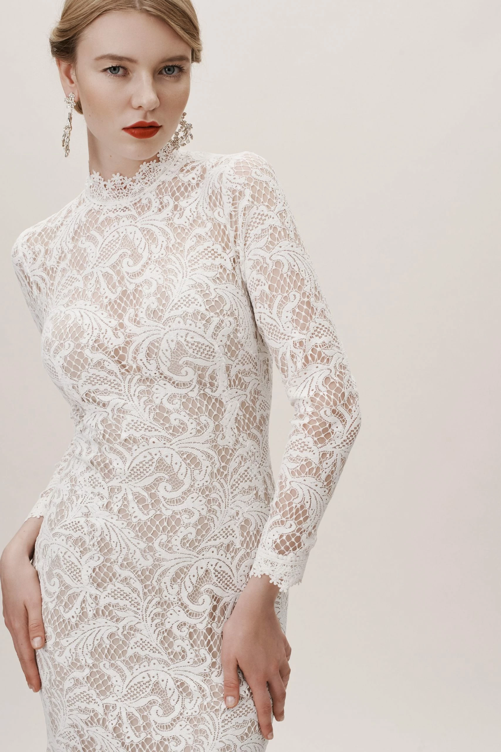 A modern take on allover lace, this gown pairs a fashion-forward mock neck with long sleeves and an open back. Fitted throughout the bodice and hips, it kicks out into a sheer lace panel for an airy finish. By Willowby by Watters.