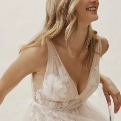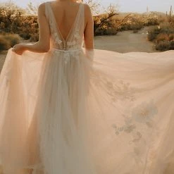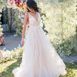 Lace appliques peek through layers of ethereal tulle, while a nude lining brings subtle color to this stunning ballgown. The sheer bodice is complete with a plunging neckline and low back for a sultry edge.