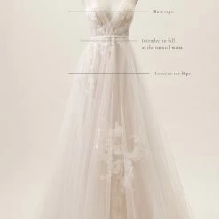 Size 4. This gown is missing most of the buttons on the back. It is advised that you replace all buttons so they are the same. This is a super easy fix for any seamstress. Minor wear along the zipper and hemline from being tried on (not an issue since most brides need to shorten this dress). Otherwise in excellent condition. Price has been reduced.