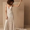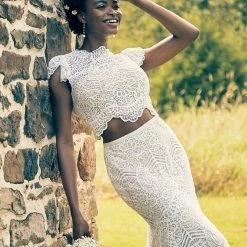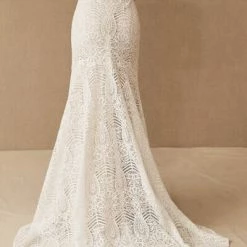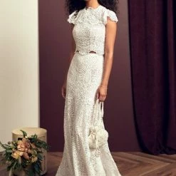 Fitted to the knee, this allover lace skirt flares dramatically to create a sweeping silhouette.