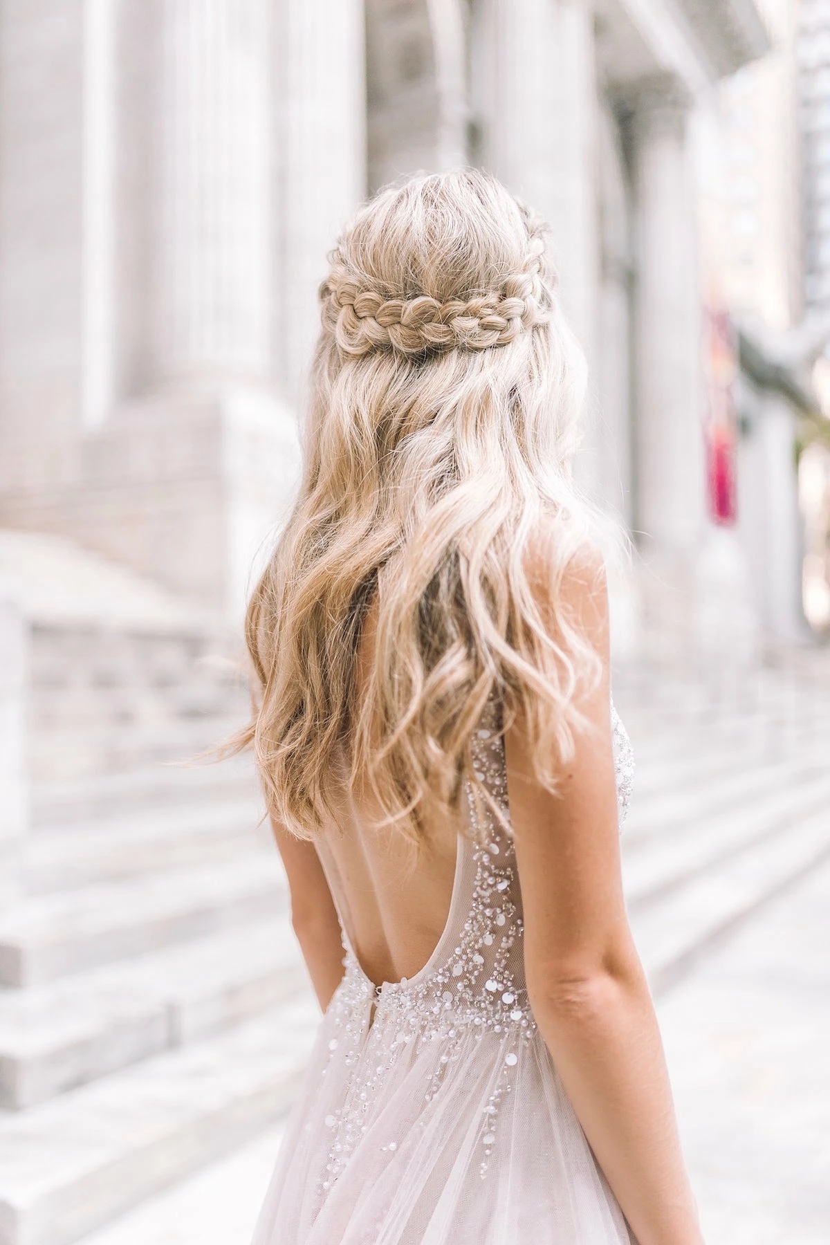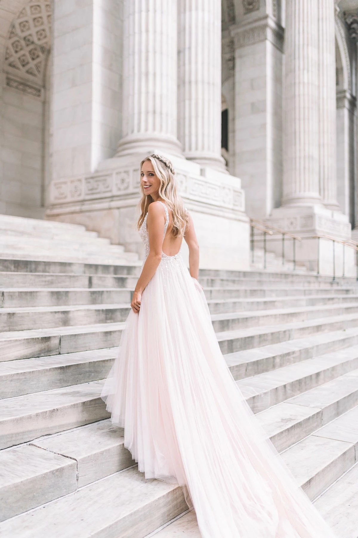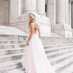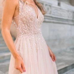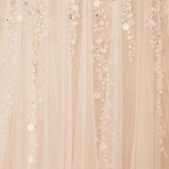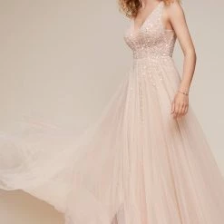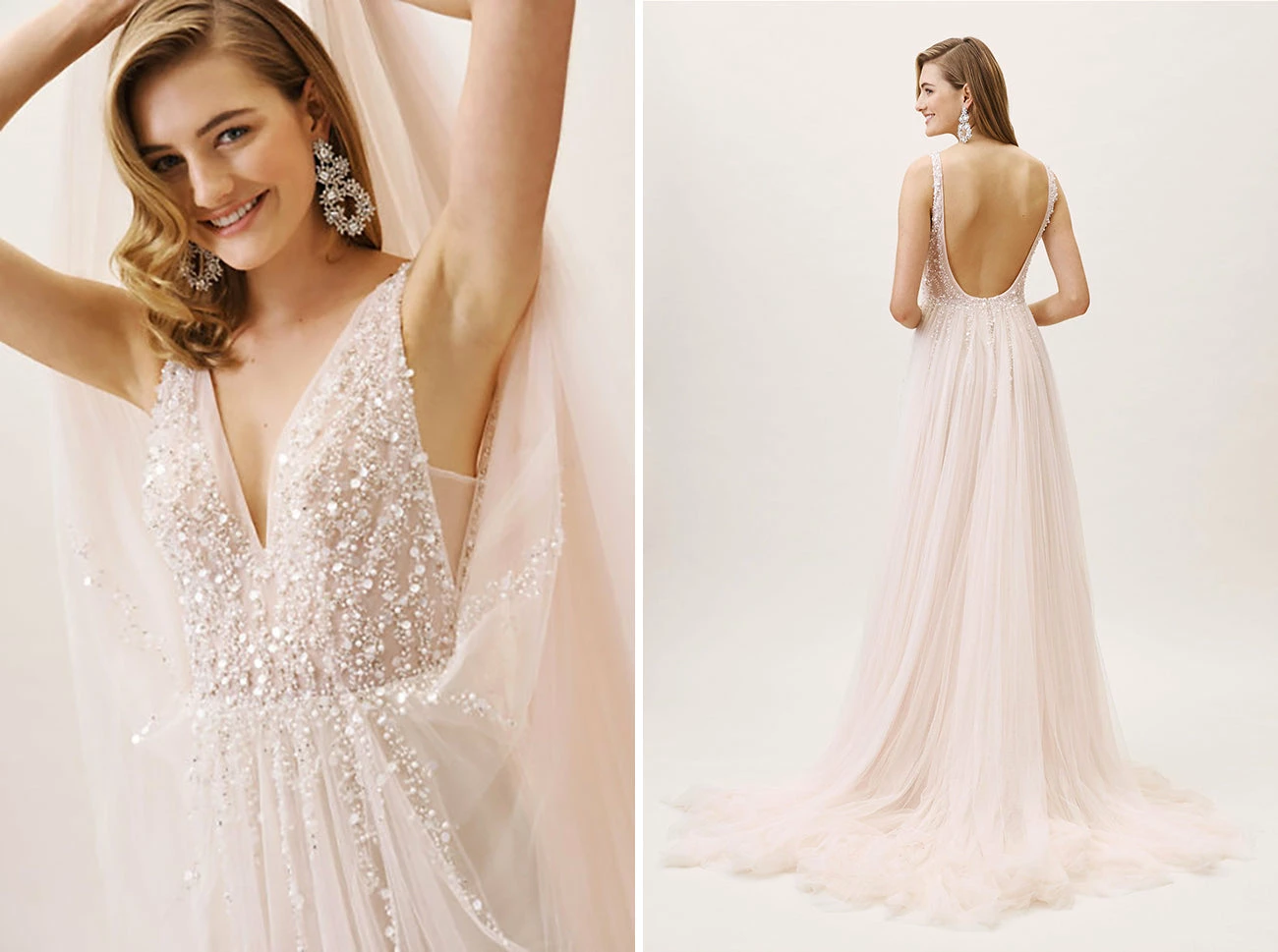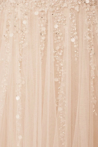A layer of glitter tulle adds subtle shine to this frothy blush ballgown. Sheer and backless, the sultry v-neck bodice is embellished with twinkling sequins. Color: Ivory Blush. By BHLDN.