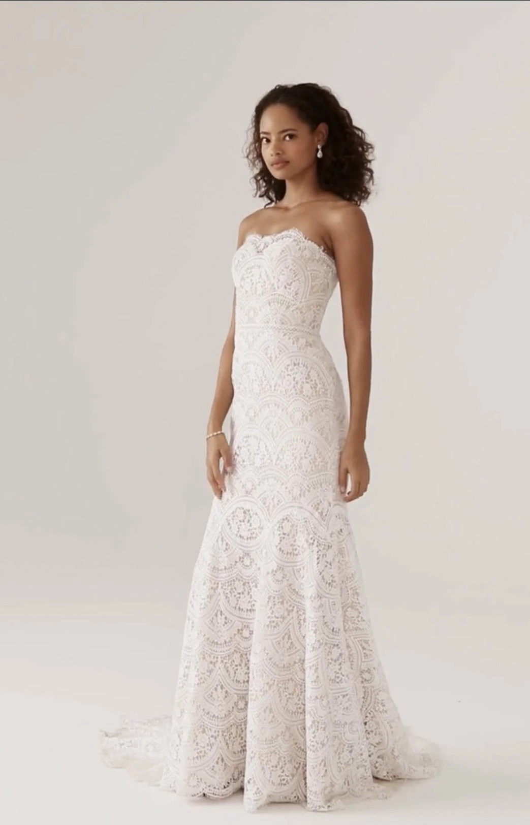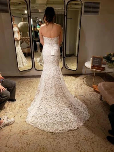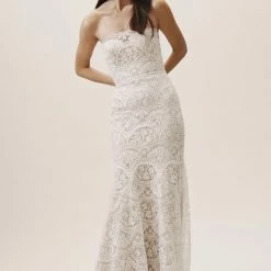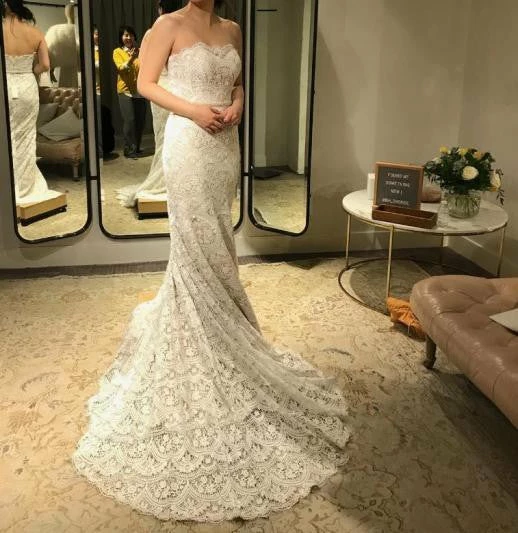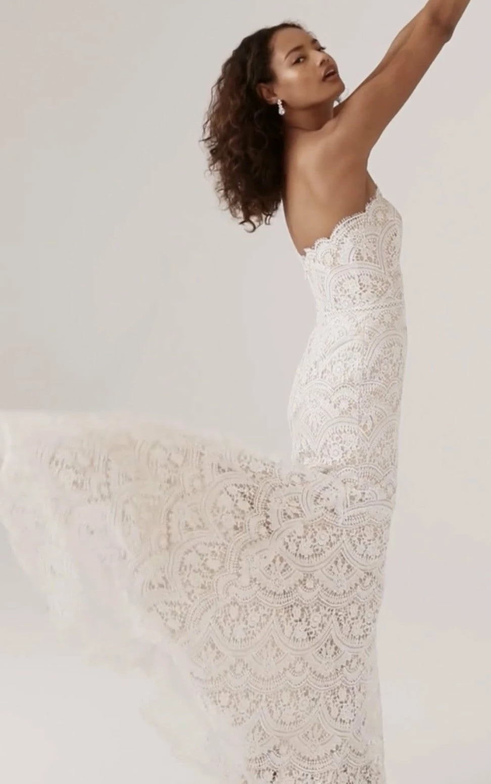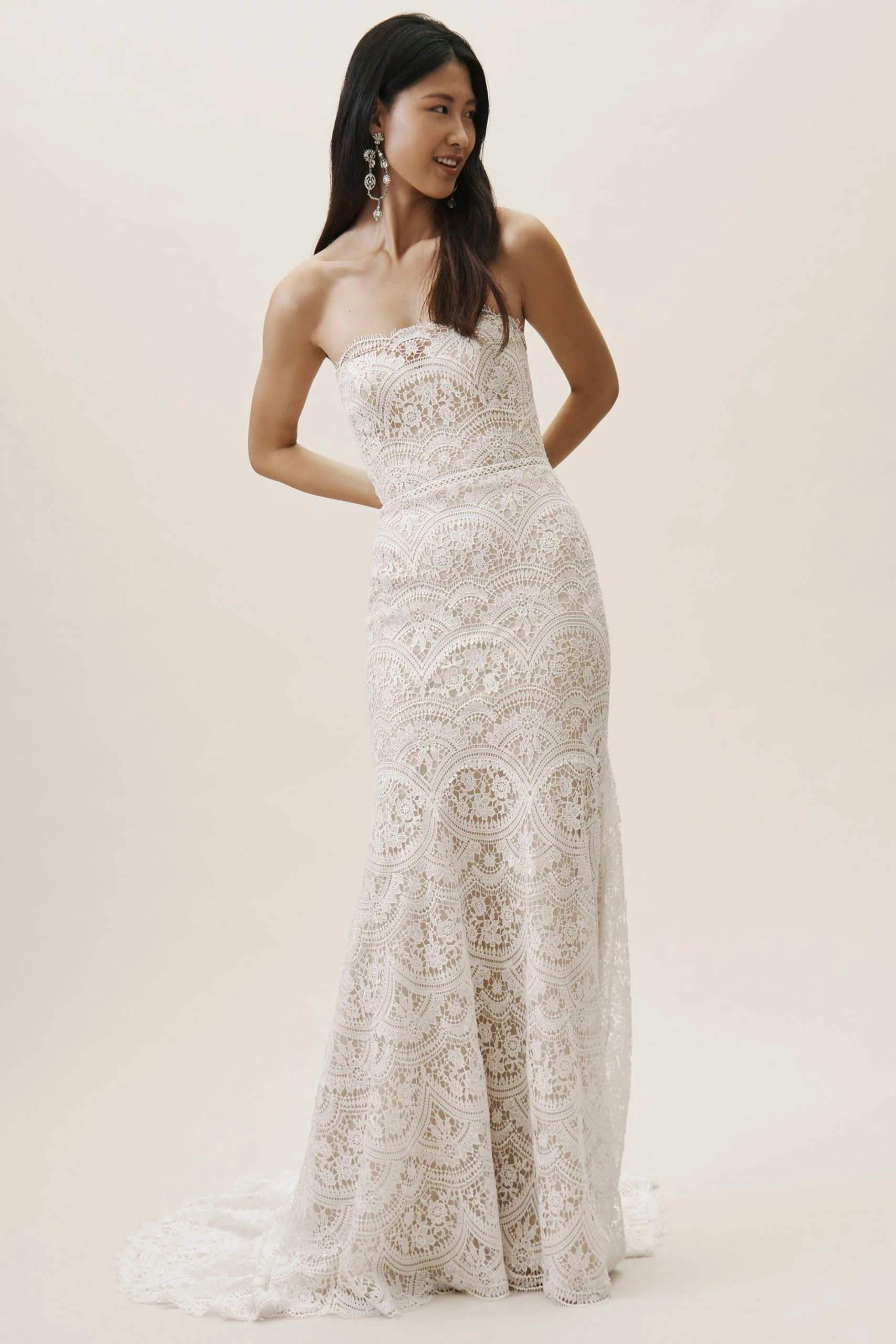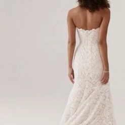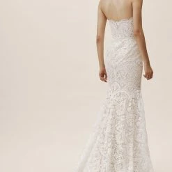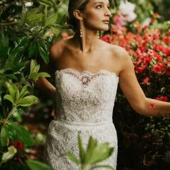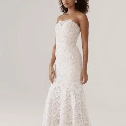 Crafted from baroque lace, this body-skimming gown features a modified mermaid silhouette and classic strapless neckline. By Wtoo by Watters.
