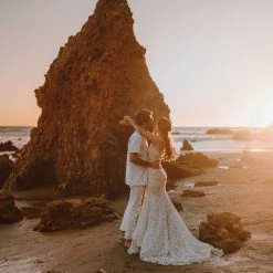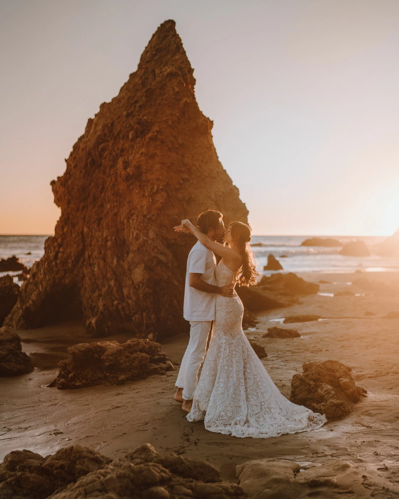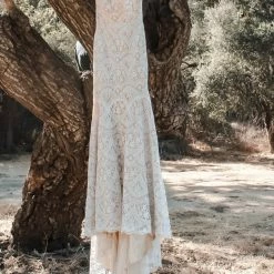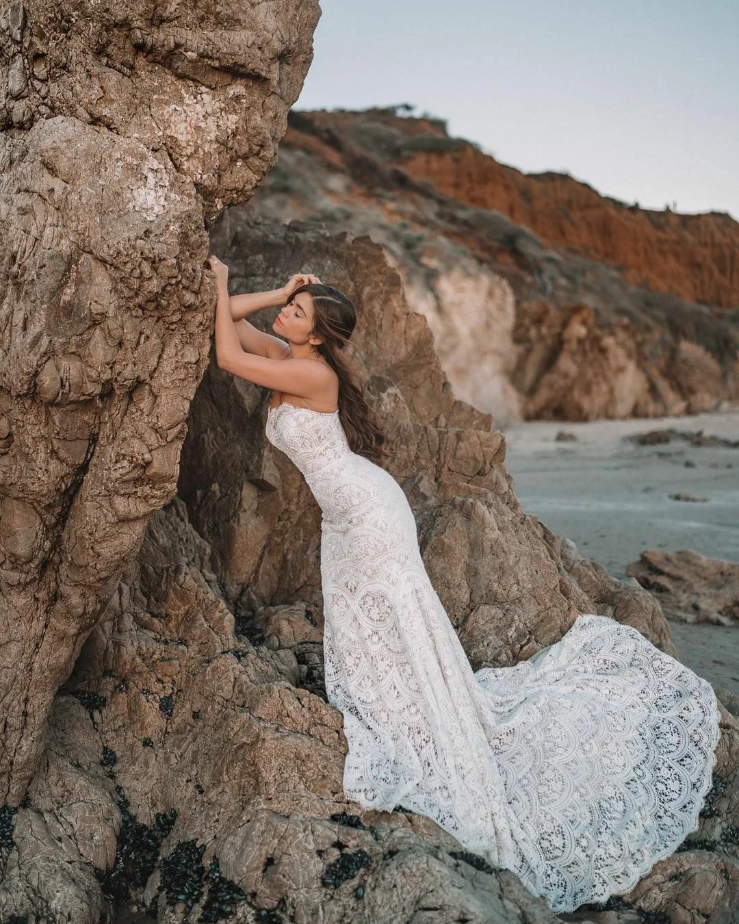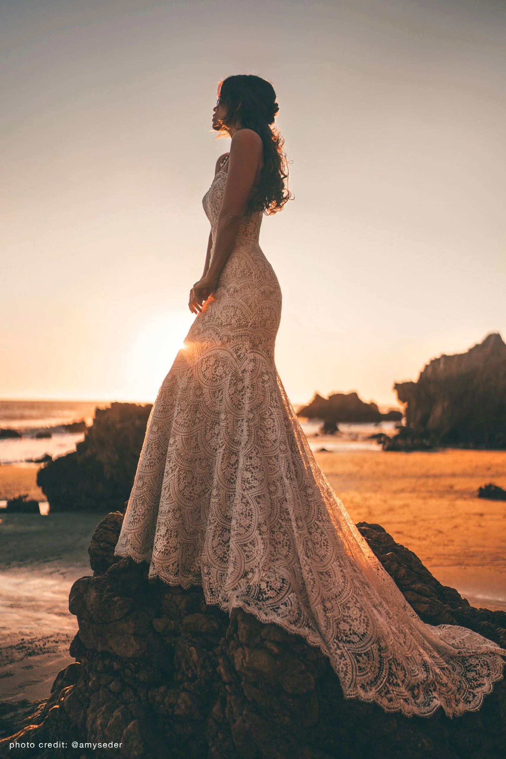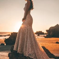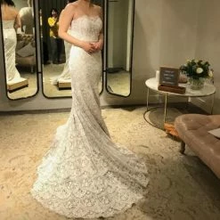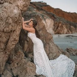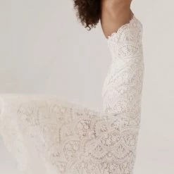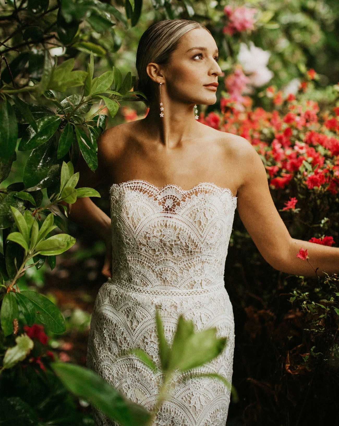 Crafted from baroque lace, this body-skimming gown features a modified mermaid silhouette and classic strapless neckline. By Wtoo by Watters.