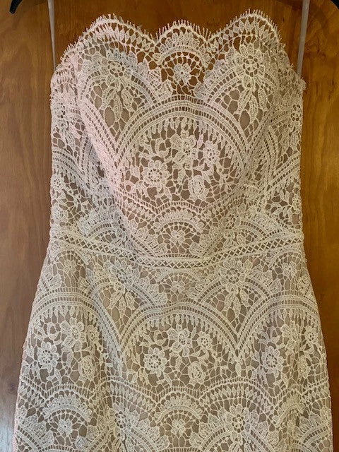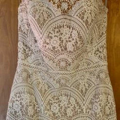 Size 14. Has been tried on in store and has minor dust along the hemline and minor pilling on the inside from being tried on (not noticeable when worn). Otherwise in very good condition. Never worn outside the salon, never altered. Retail price: $1,600. Color: Ivory / Almond. Â