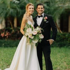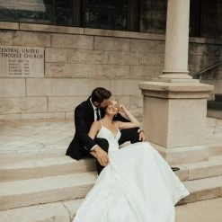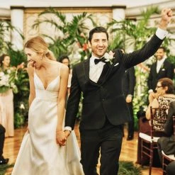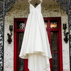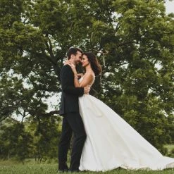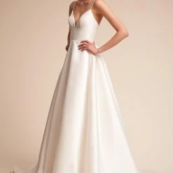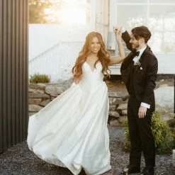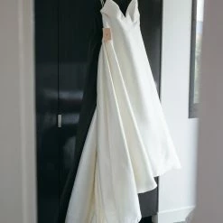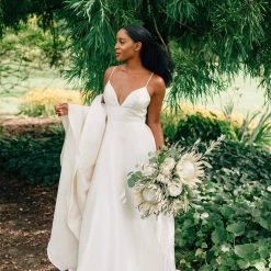 We love this ballgown’s 90s-influenced edge—it’s chic and elegant without all the frills. Lustrous satin, a plunging v-neck, and spaghetti straps make a decidedly modern statement. The dress is an absolute dream!