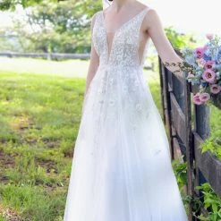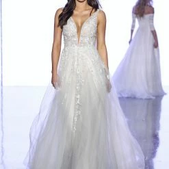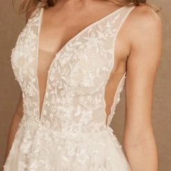 Accented by silver threads and intricate beading, embroidered ivory blooms cascade down the bodice and across the skirt of this frothy tulle ballgown. A plunging v-neckline neckline with an illusion panel and delicate, sheer straps finish the look. By Wtoo by Watters.