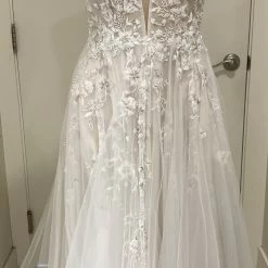 Size 14. This gown has been tried on in store, but it’s in excellent condition. Few loose threads near the zipper from being zipped up and down. But overall looks great! Retail price: $1,595!