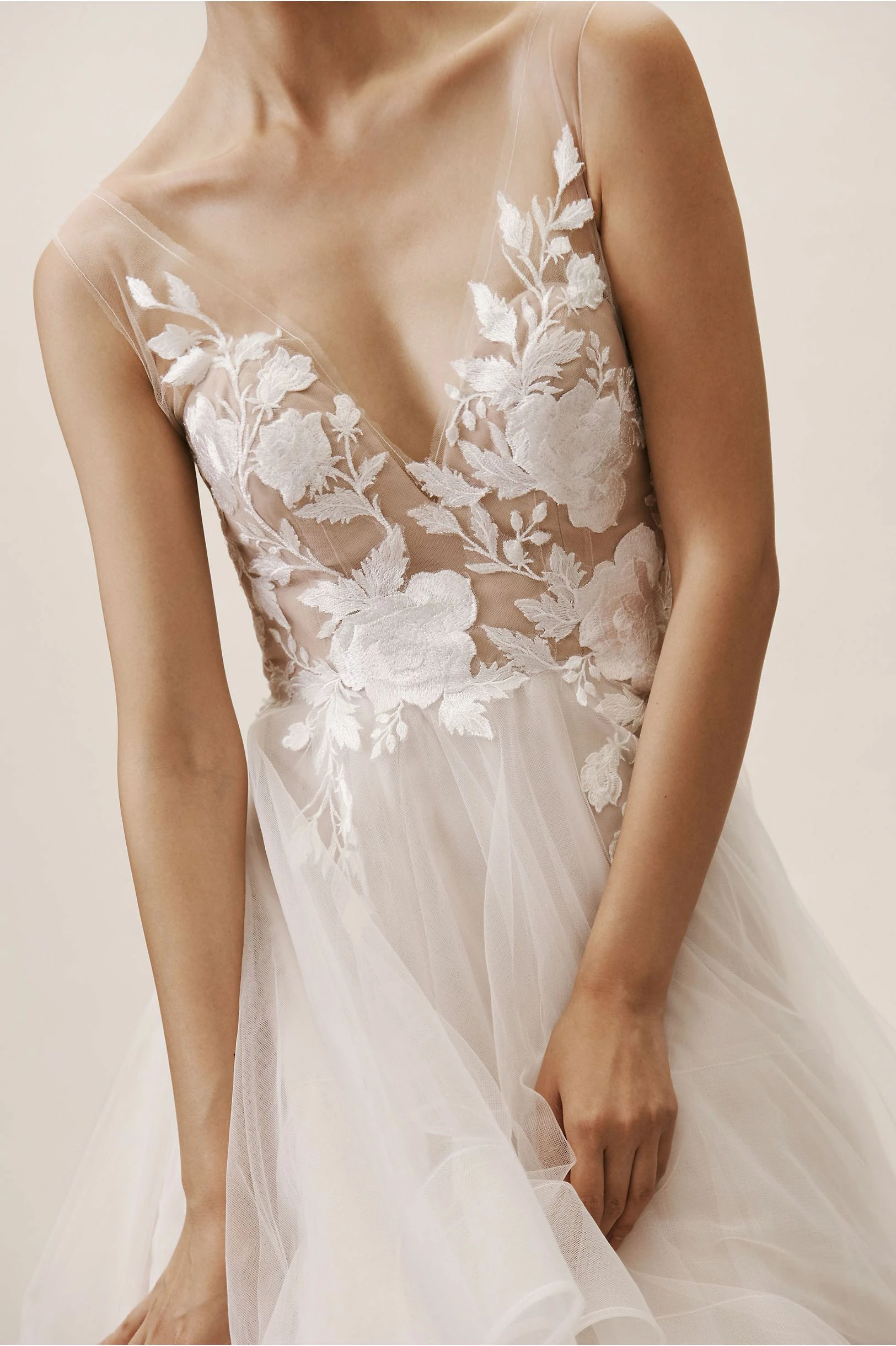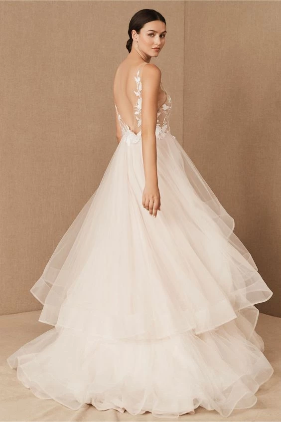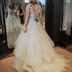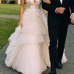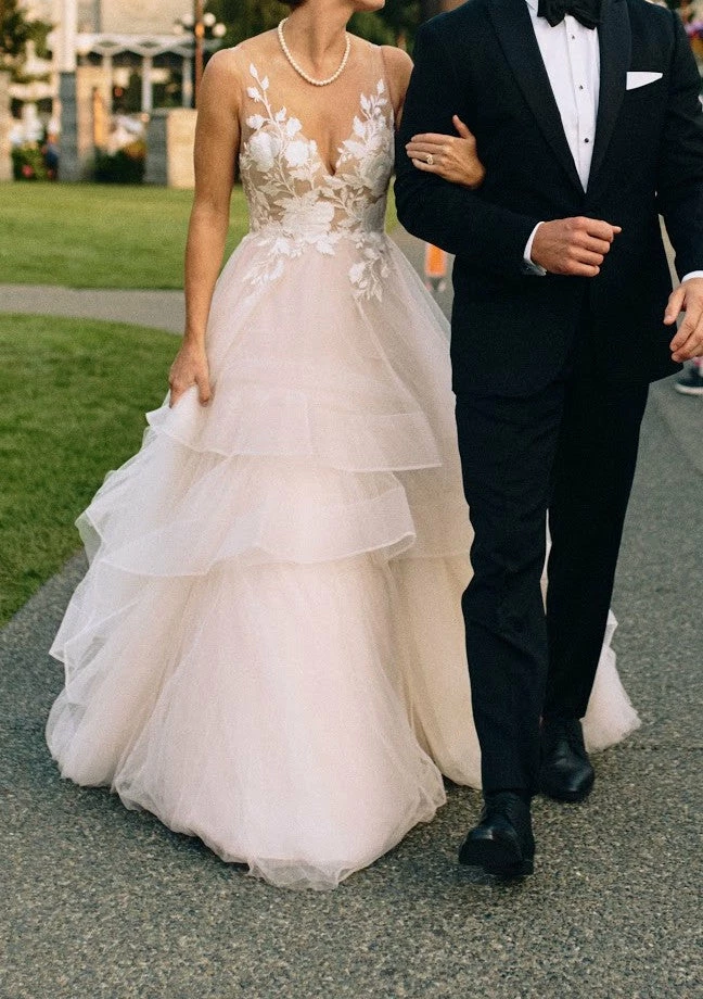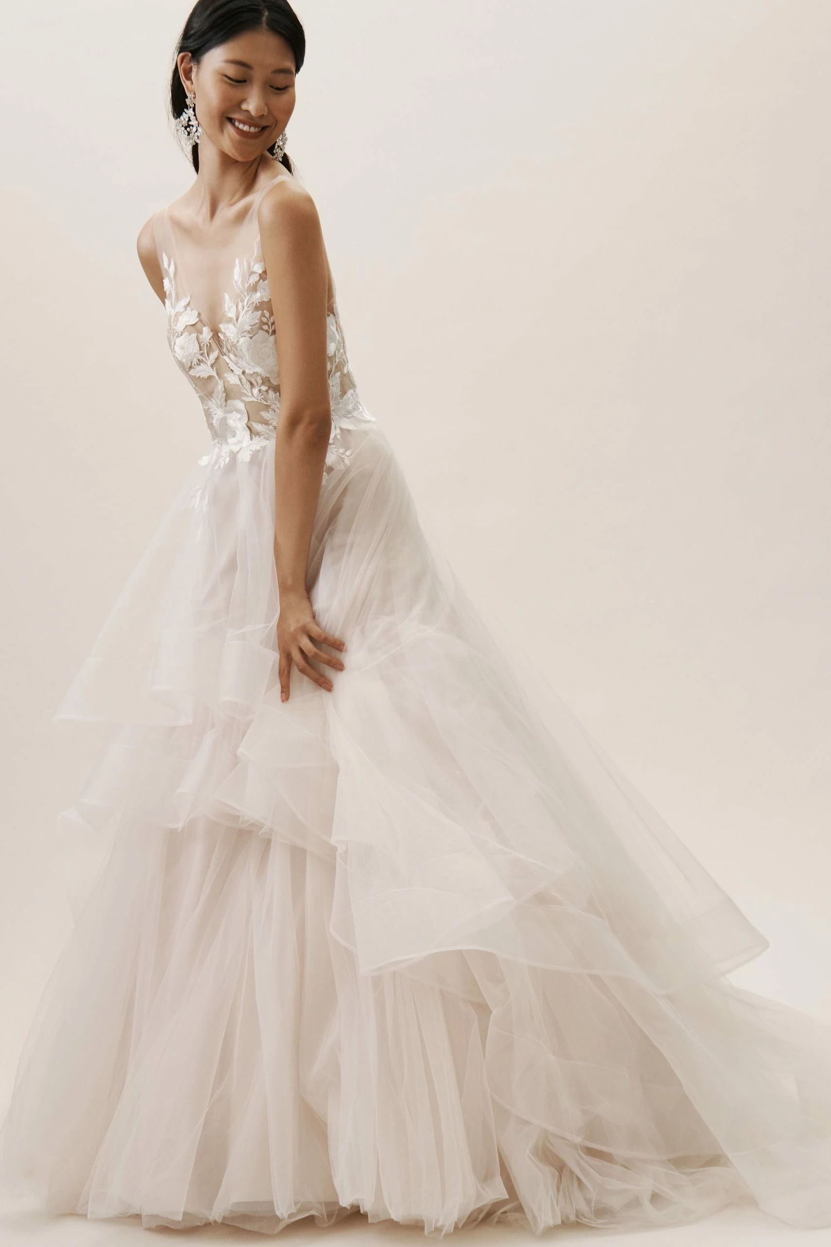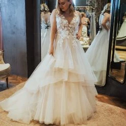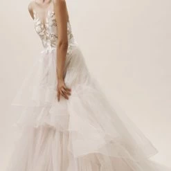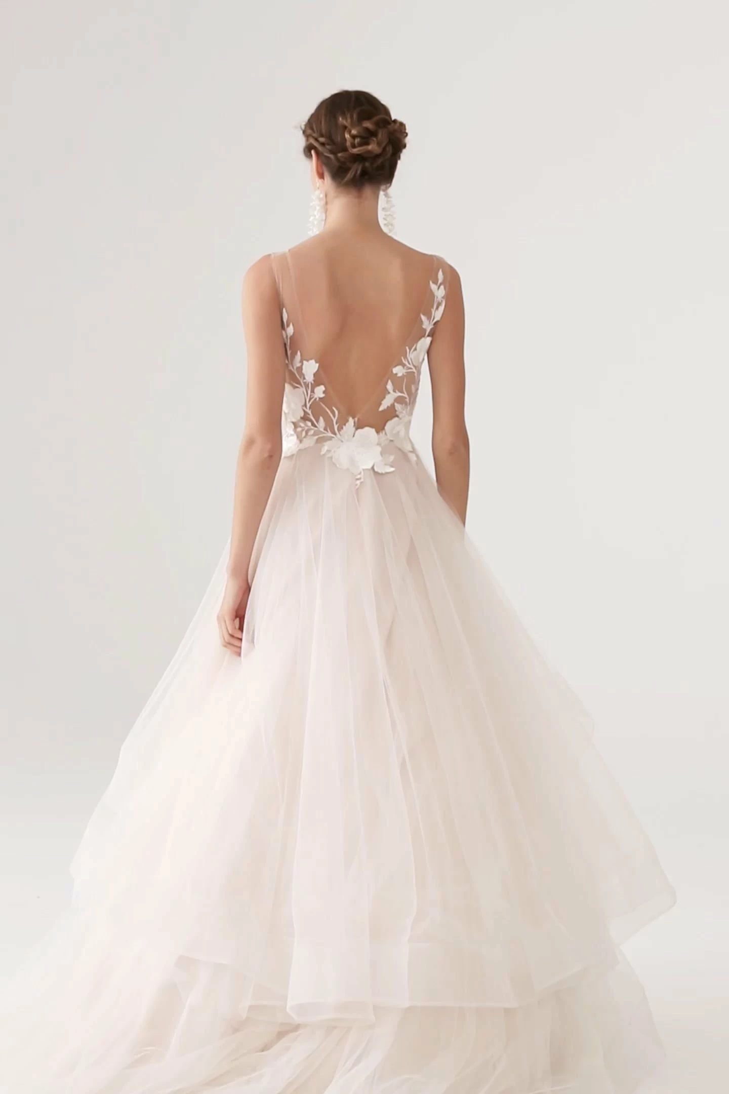 A floral-embroidered bodice features a plunging neckline and sheer back for a stunning finish, but our favorite part of this showstopping ballgown is its voluminous tiered skirt. By Wtoo.