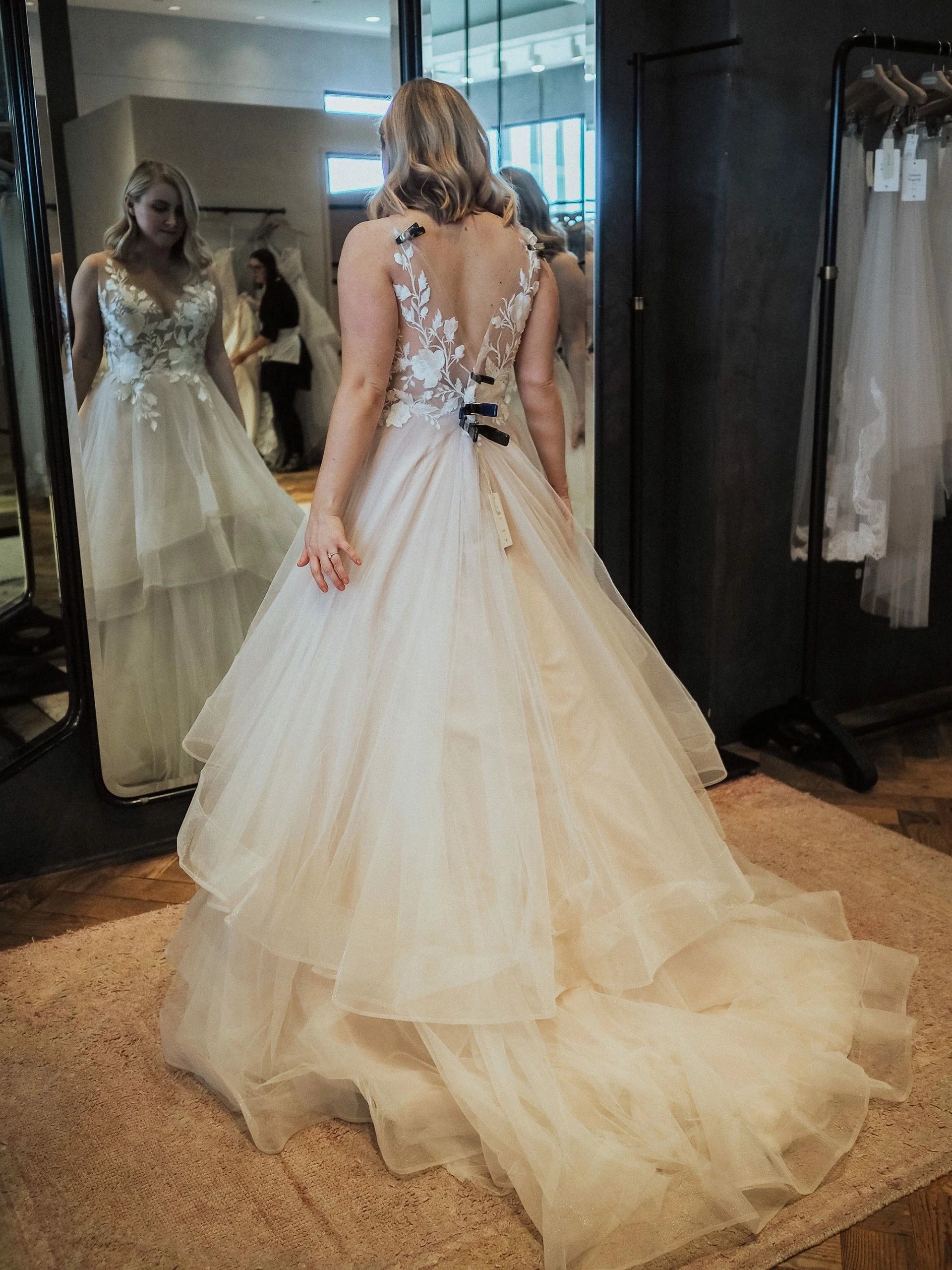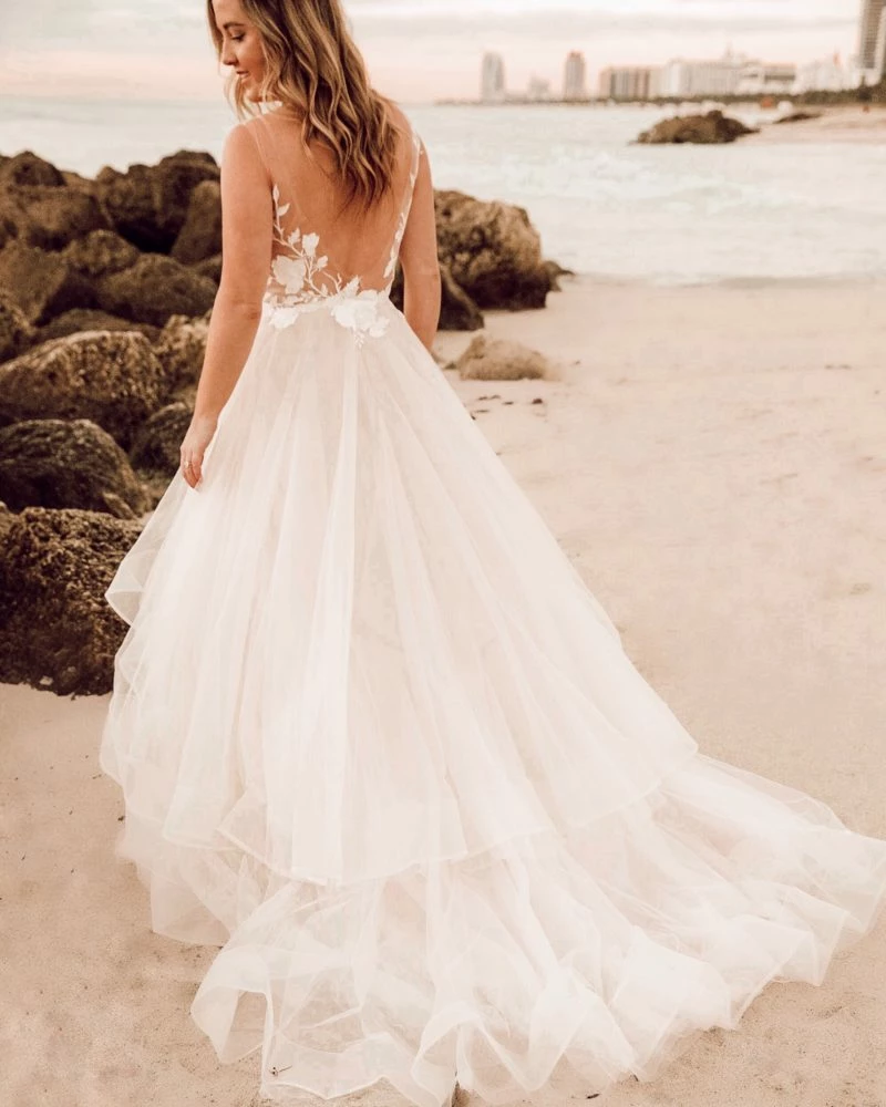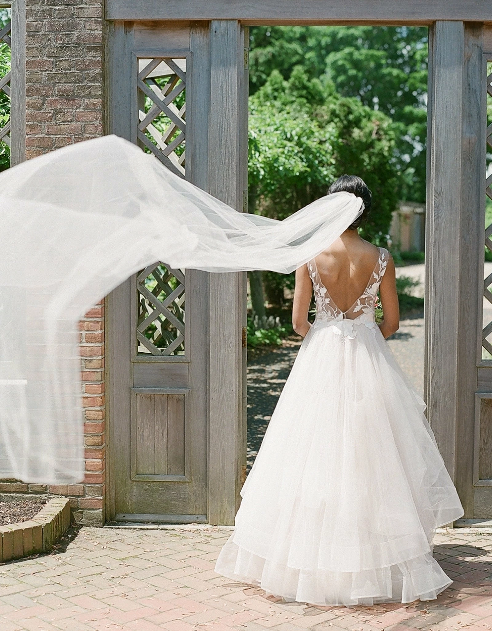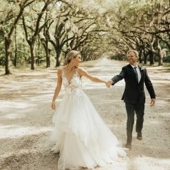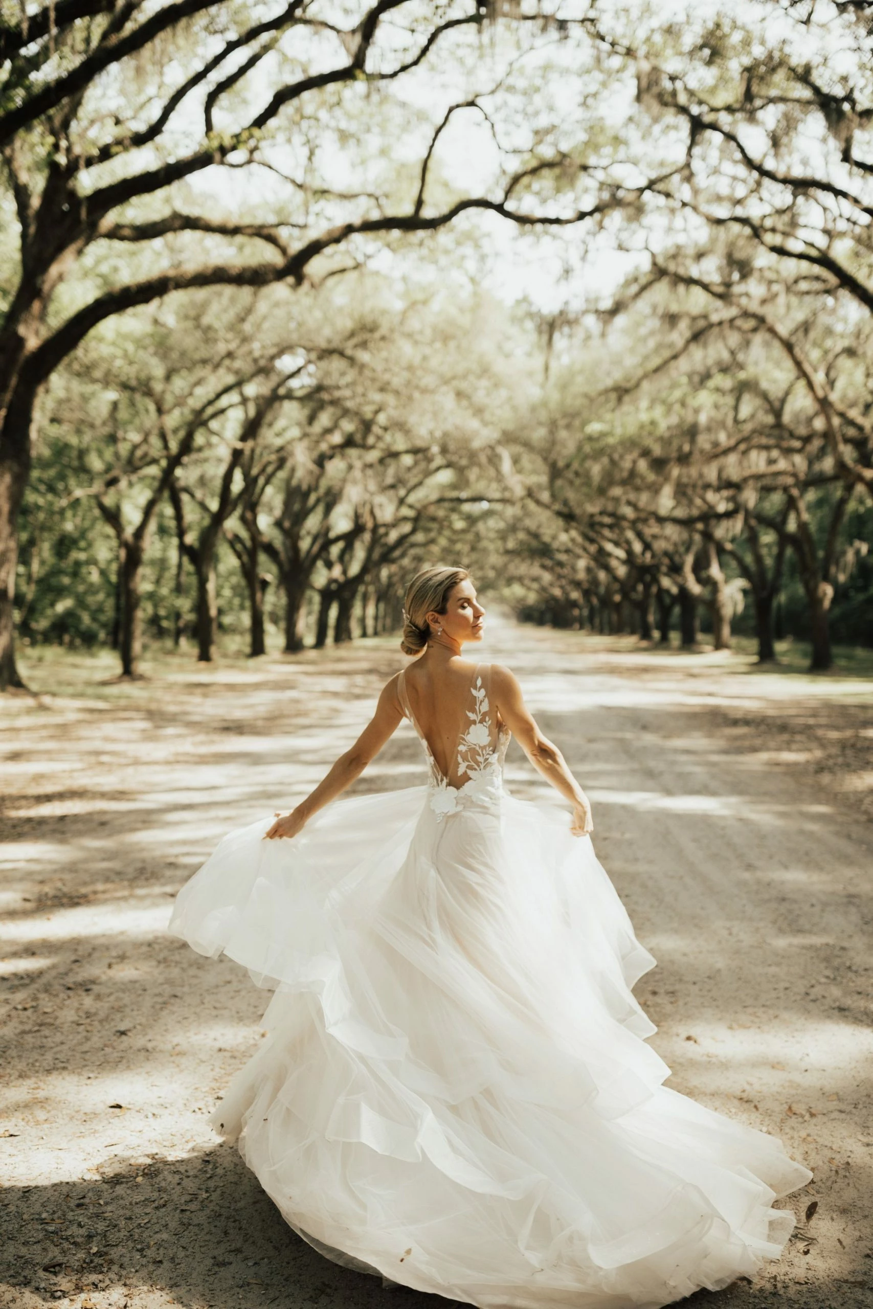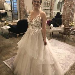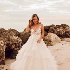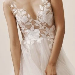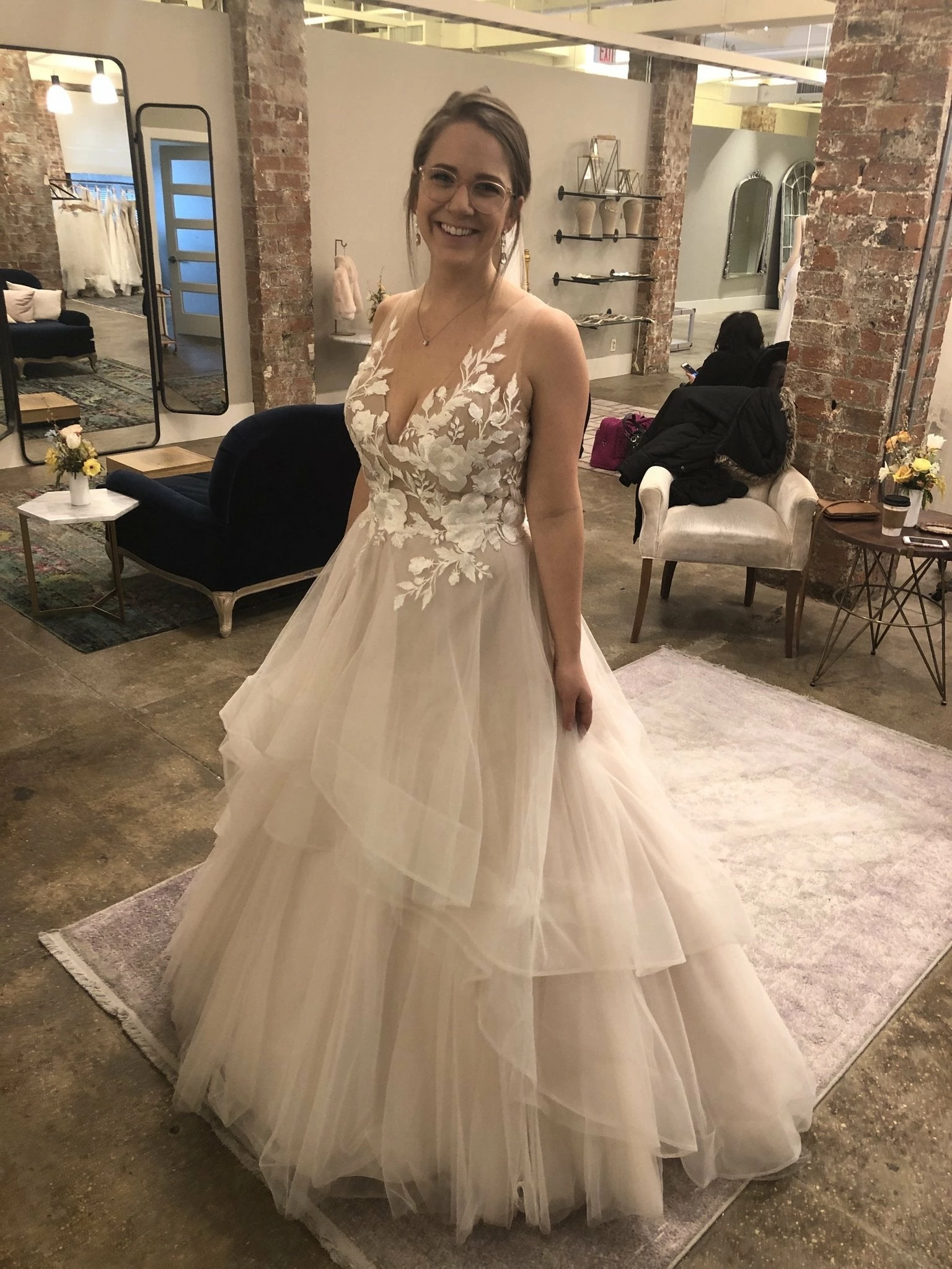 A floral-embroidered bodice features a plunging neckline and sheer back for a stunning finish, but our favorite part of this showstopping ballgown is its voluminous tiered skirt. By Wtoo.
