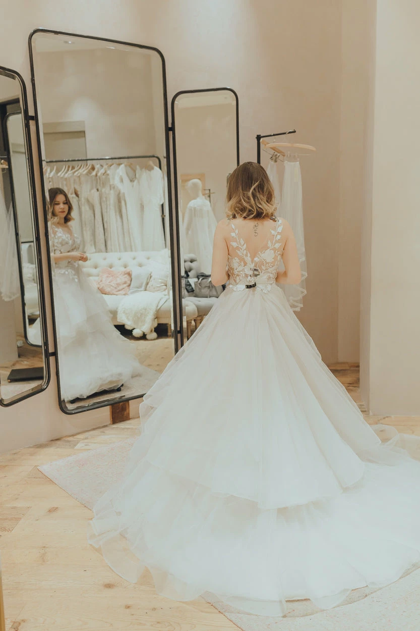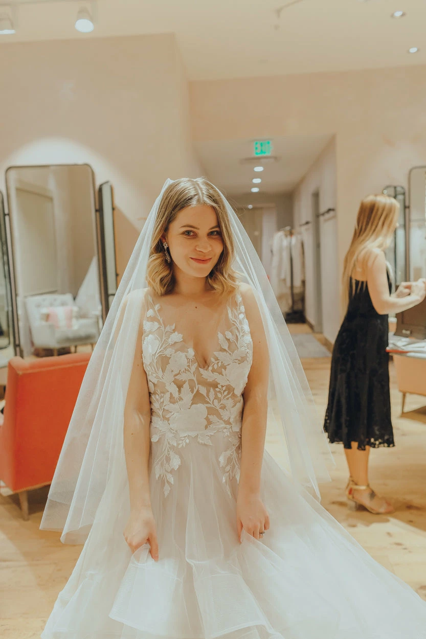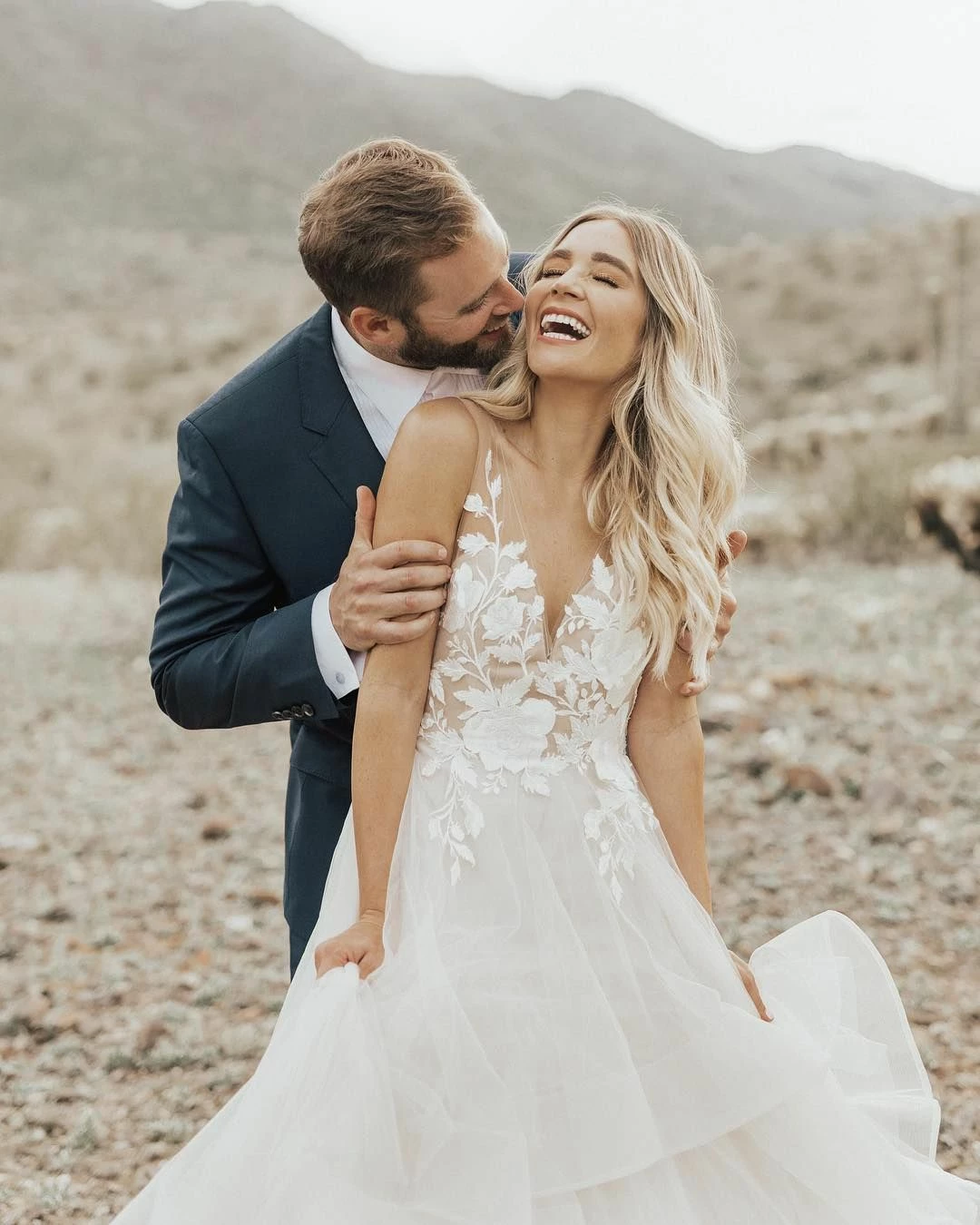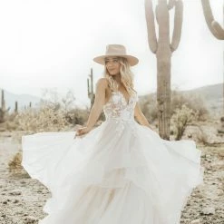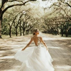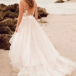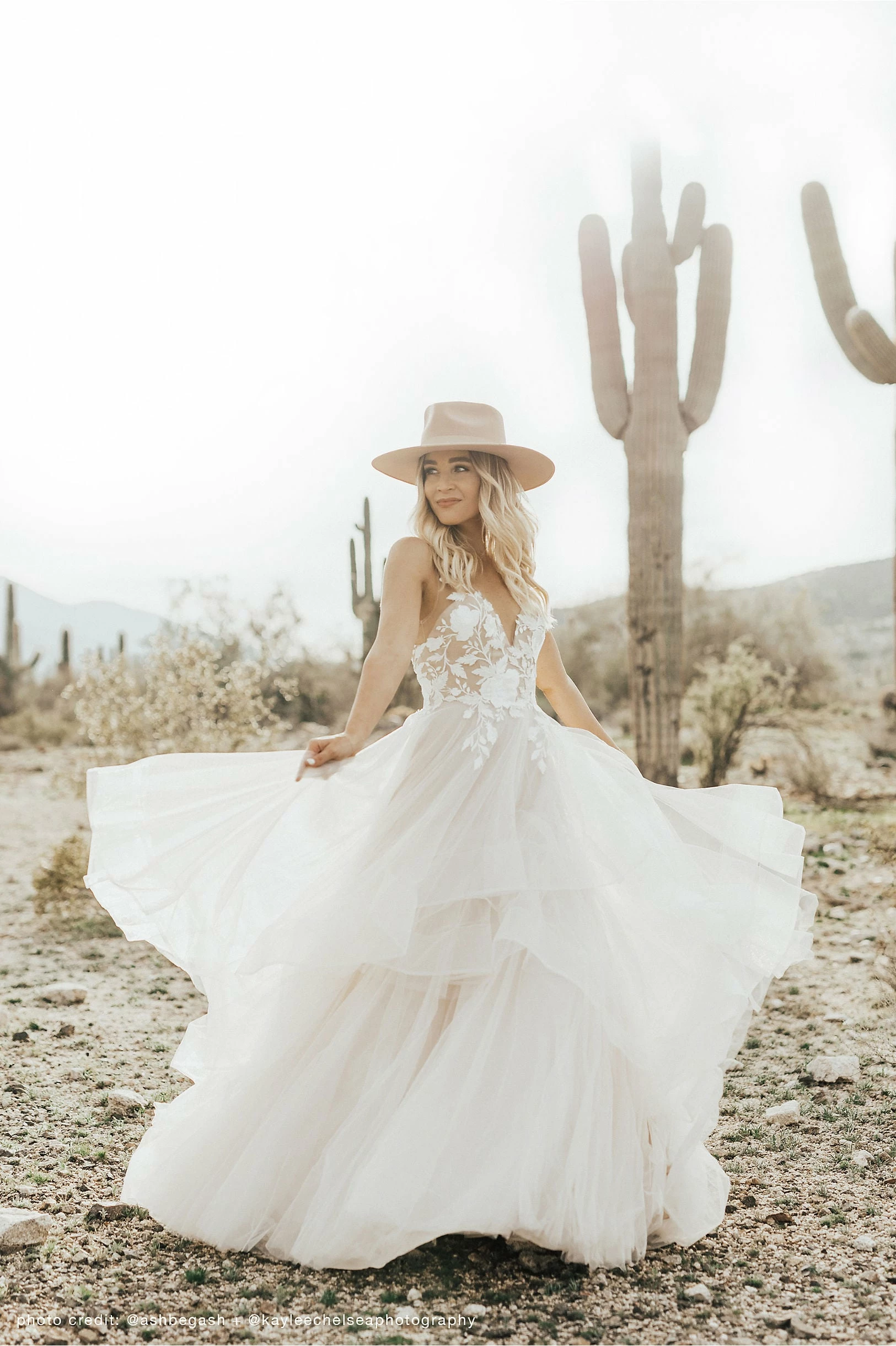 A floral-embroidered bodice features a plunging neckline and sheer back for a stunning finish, but our favorite part of this showstopping ballgown is its voluminous tiered skirt. By Wtoo.