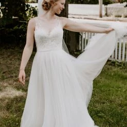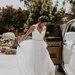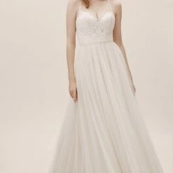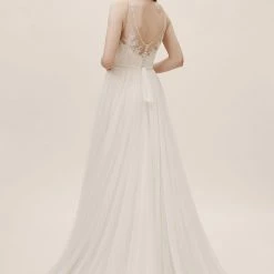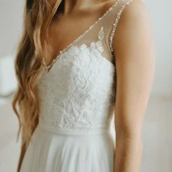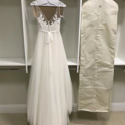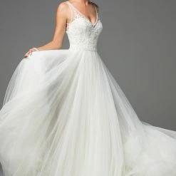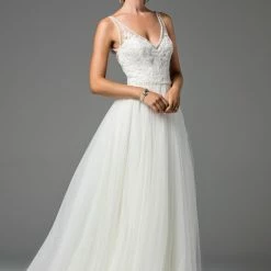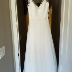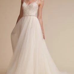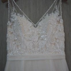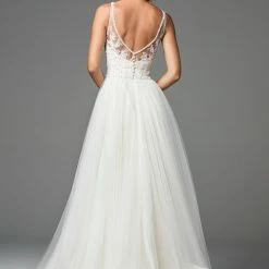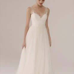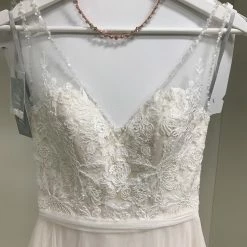 Trimmed in sparkle, this effortless v-neck gown exudes romance. Intricate illusion lace, replete with glistening beads, ascends from the bodice and a frothy tulle skirt finishes the look.  A bonus: pearl buttons down the back! English net sash included. By Watters From the Wtoo by Watters line.