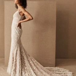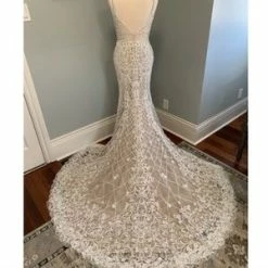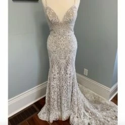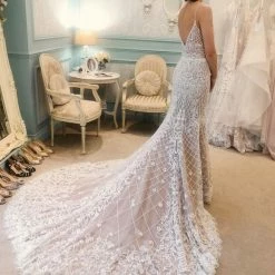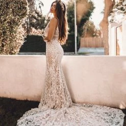 A latticework of beading adds subtle shimmer atop this fitted gown’s intricate lace. A strappy, plunging neckline and dramatic train complete the look. By Wtoo by Watters.