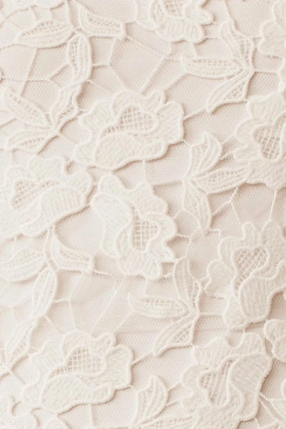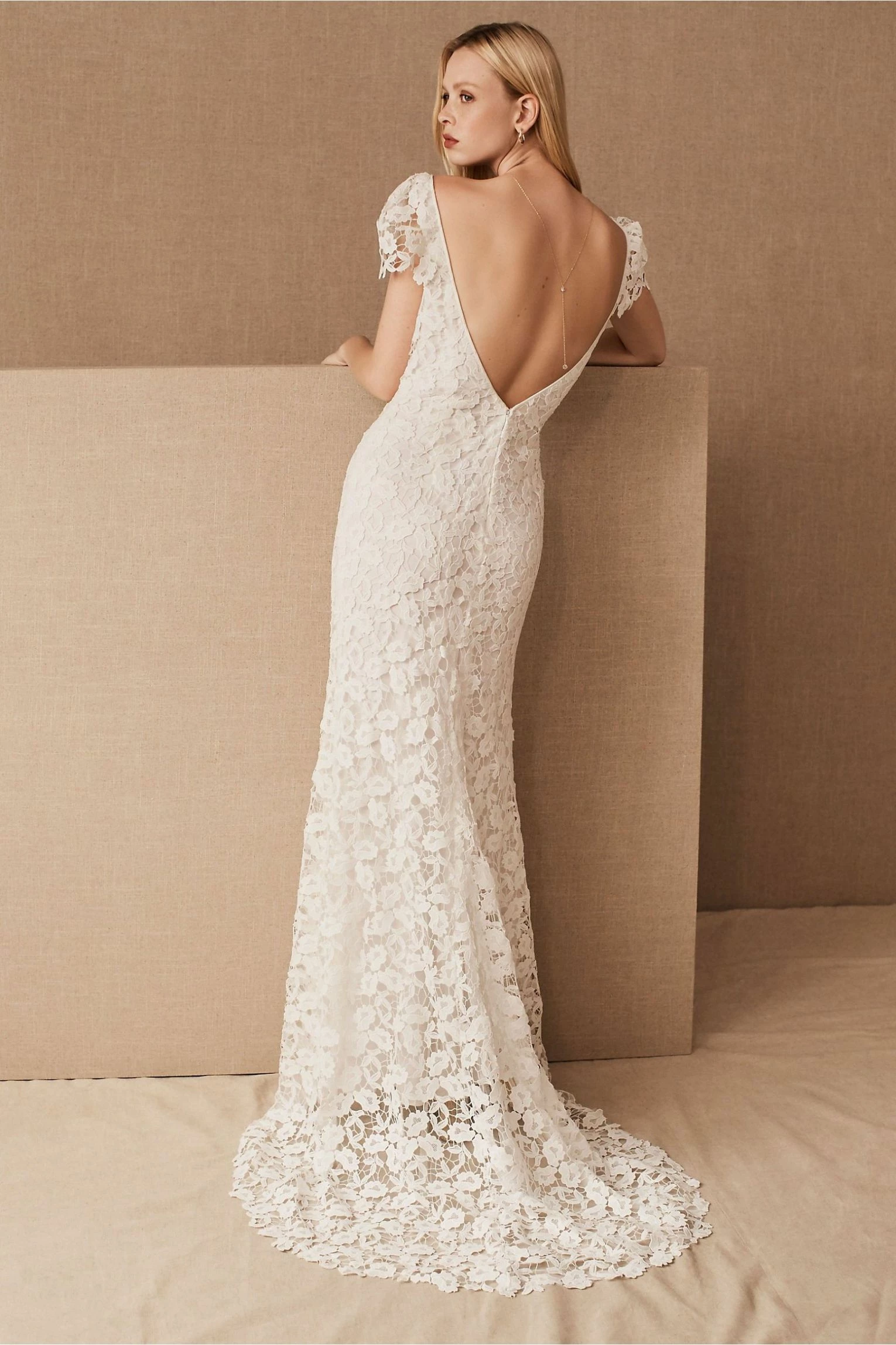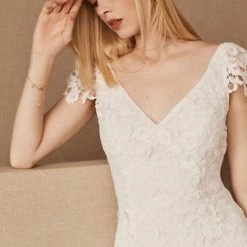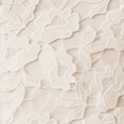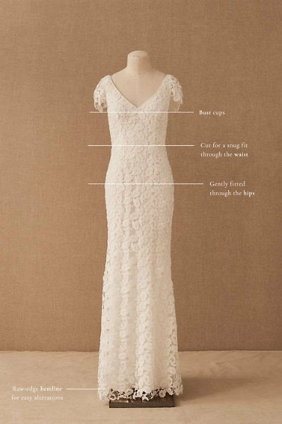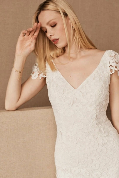 This vintage yet minimalistic column gown is capped off with sheer cap sleeves, has a classic V-neckline and an open-back design. The floral Guipure lace also introduces a unique texture to the dress. An effortless and chic column gown.