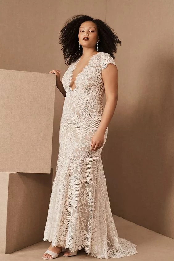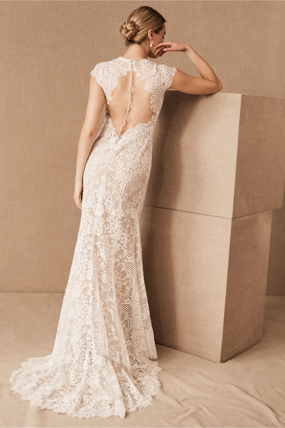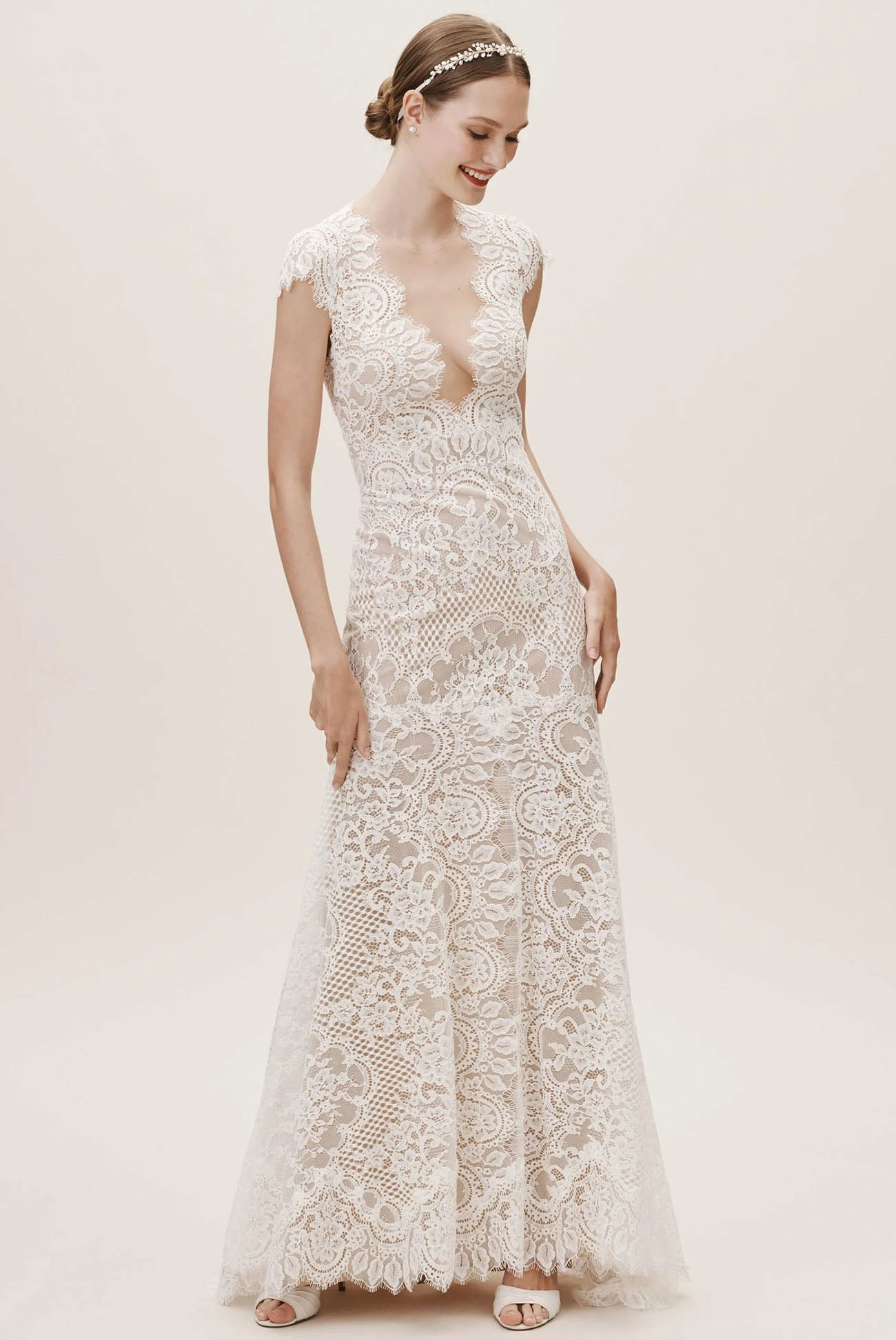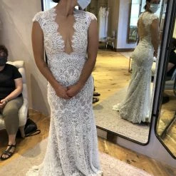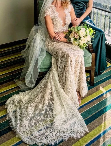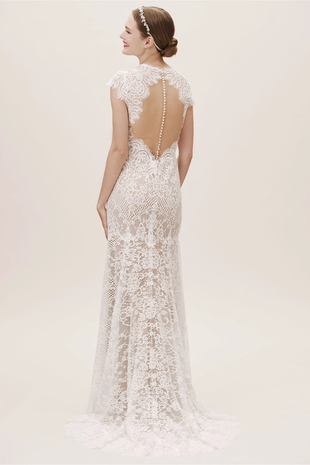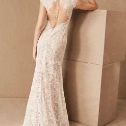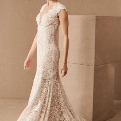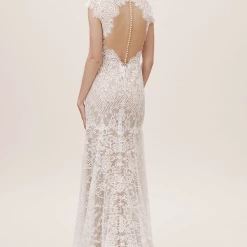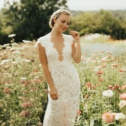 Intricate corded lace was designed specifically to suit the silhouette of this gown, resulting in a flawless fit and lighter-than-air construction. Cap sleeves and a plunging neckline complete the bodice, while the open back is embellished with a row of tiny pearl buttons. By Wtoo by Watters.