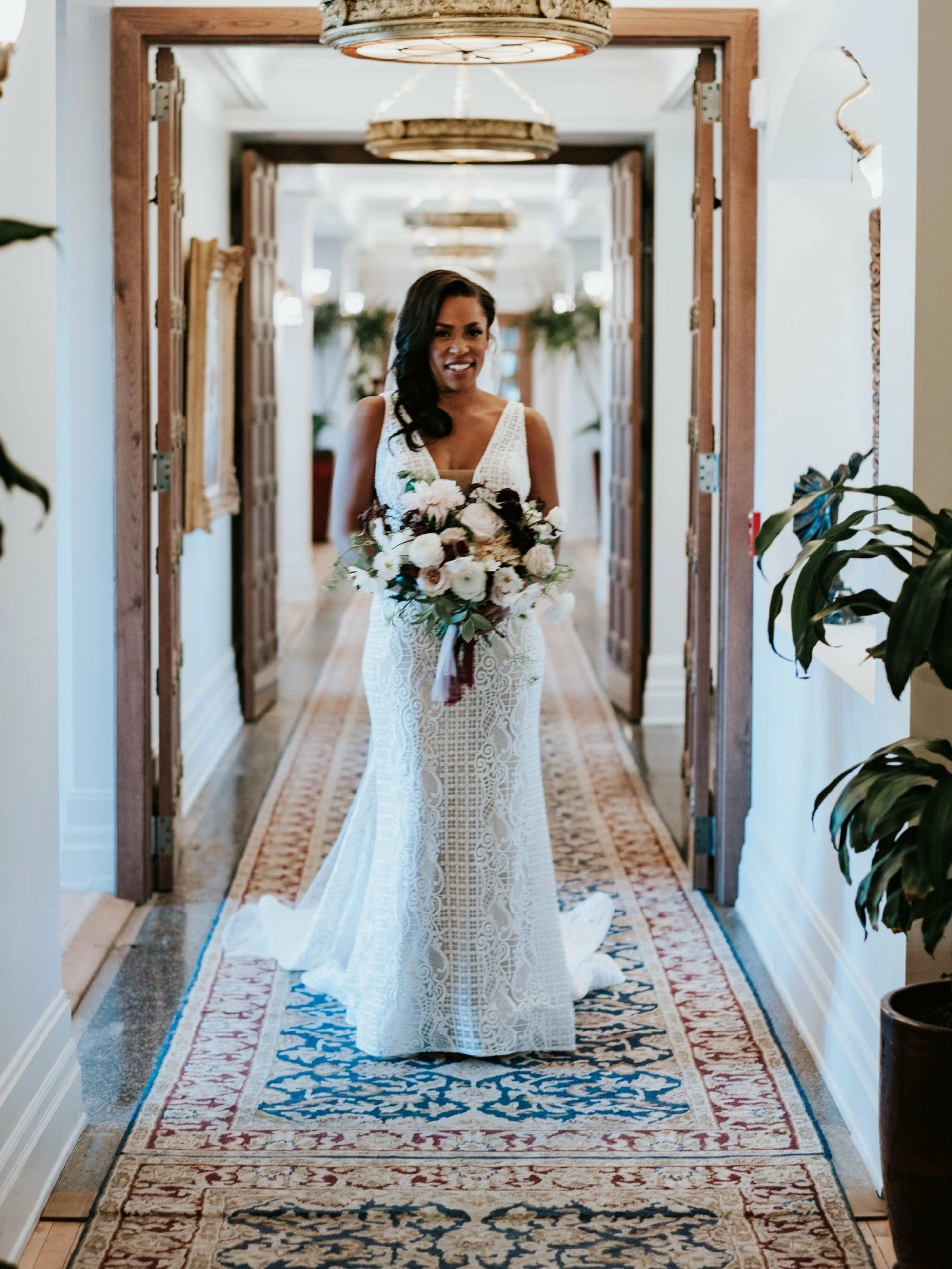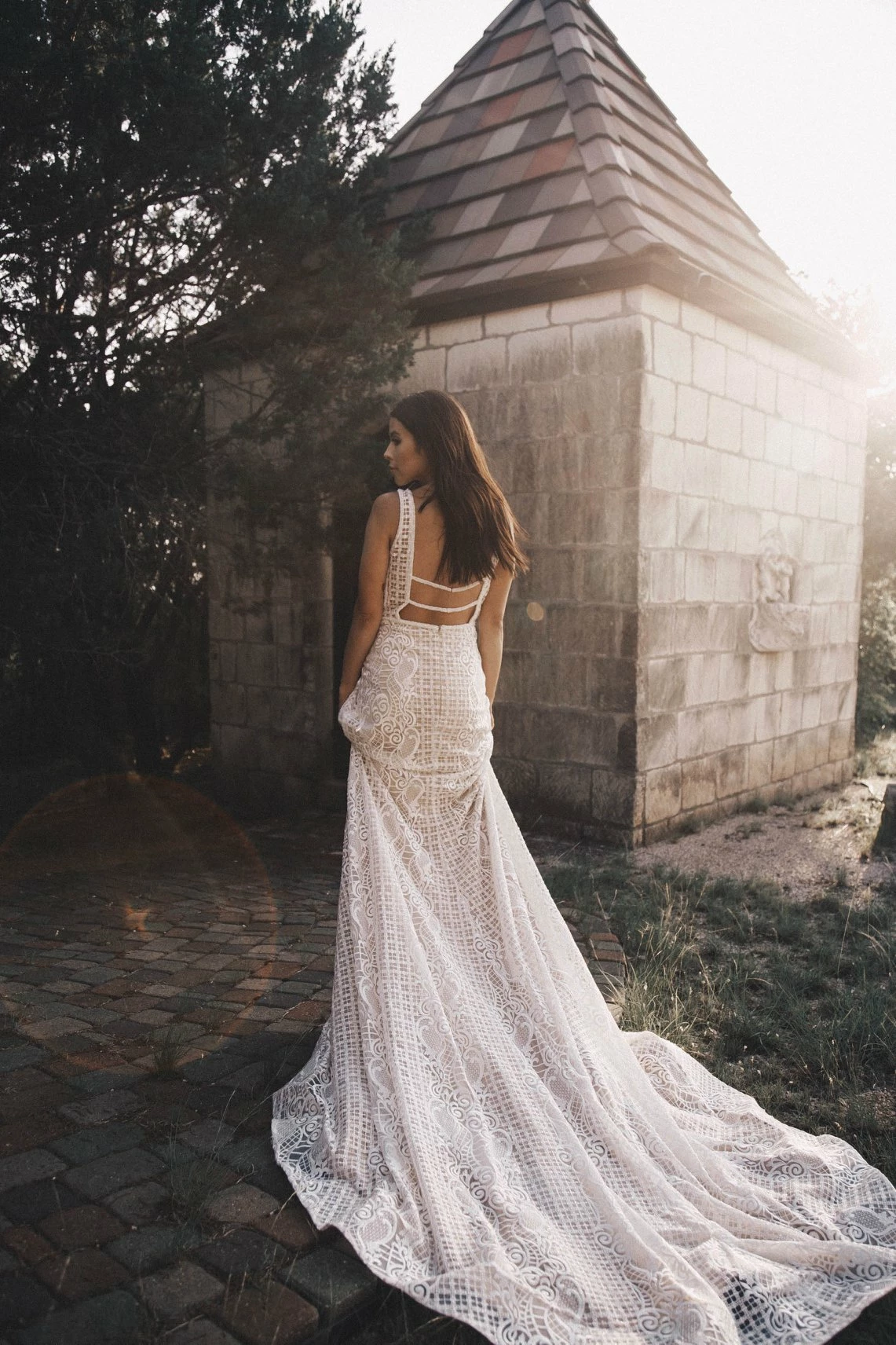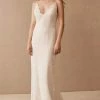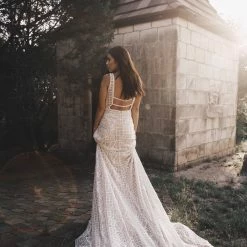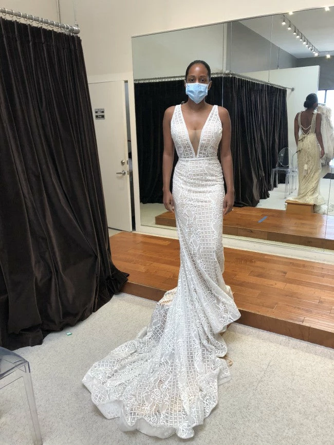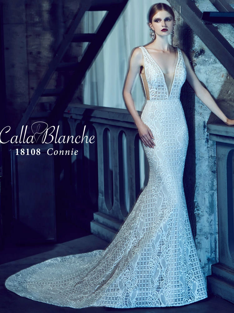 The Calla Blanche Connie gown has a Illusional deep V-Neck neckline with a sleeveless and trumpet silhouette.  Color: Ivory / Light Nude.
