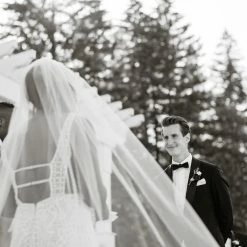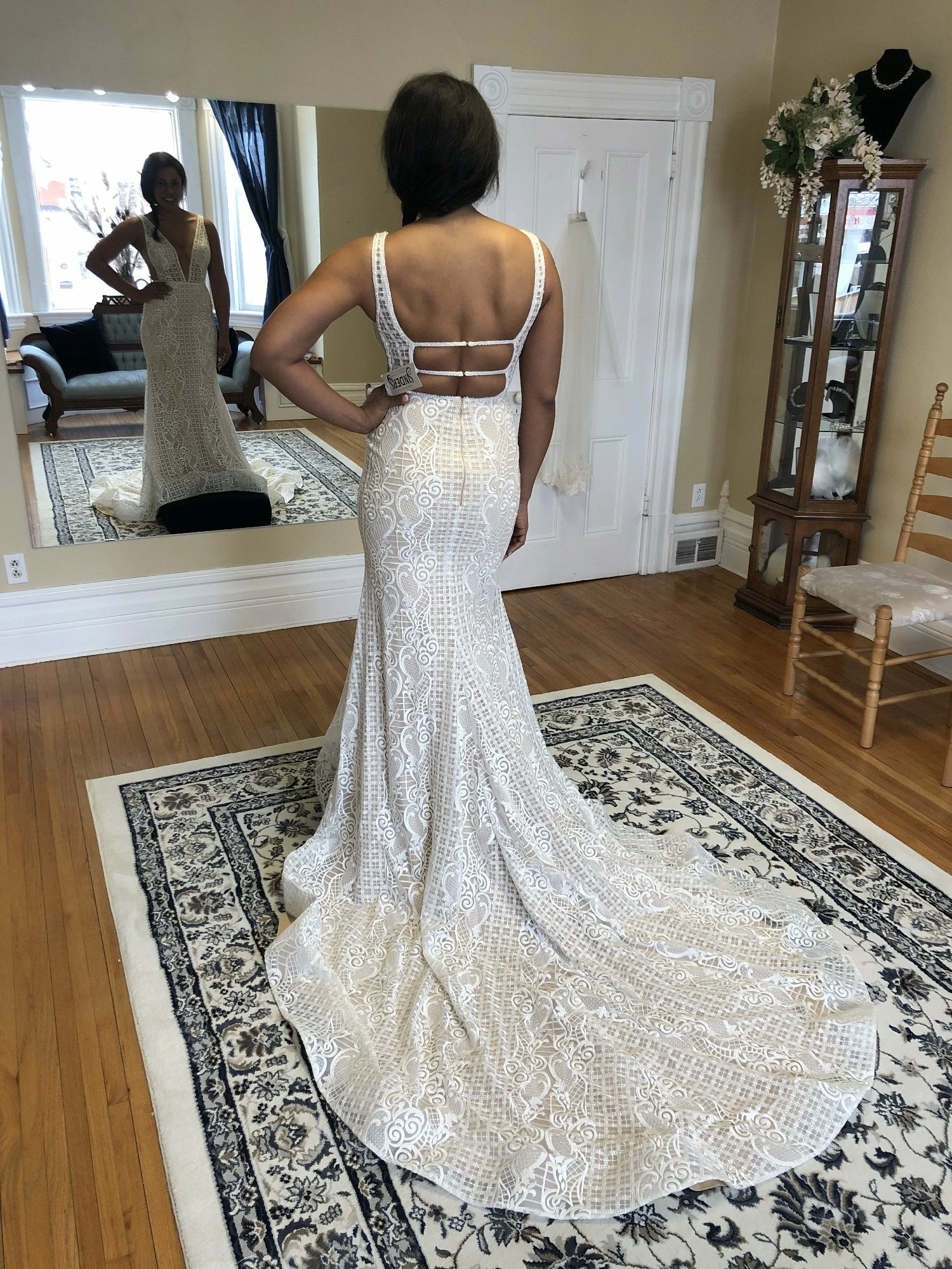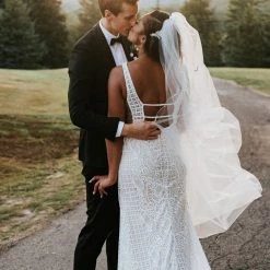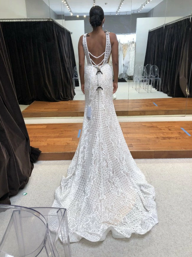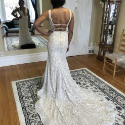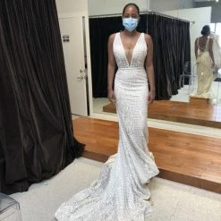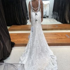Size 8. Sample gown, but in like new condition. Does not have any noticeable signs of wear. Retail tags still attached. Approximate measurements are: 36″, 27″, 38″. Retail price: $2,730!