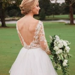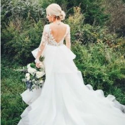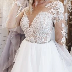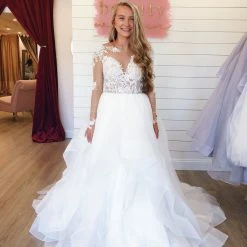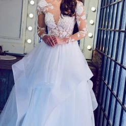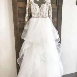 Gorgeous L’Amour by Calla Blanche gown. Color:  Ivory with light nude illusion. Fun and uniquely stylish gown, layered skirt with horse hair edge, long sleeve with illusion bodice and lace detailing.