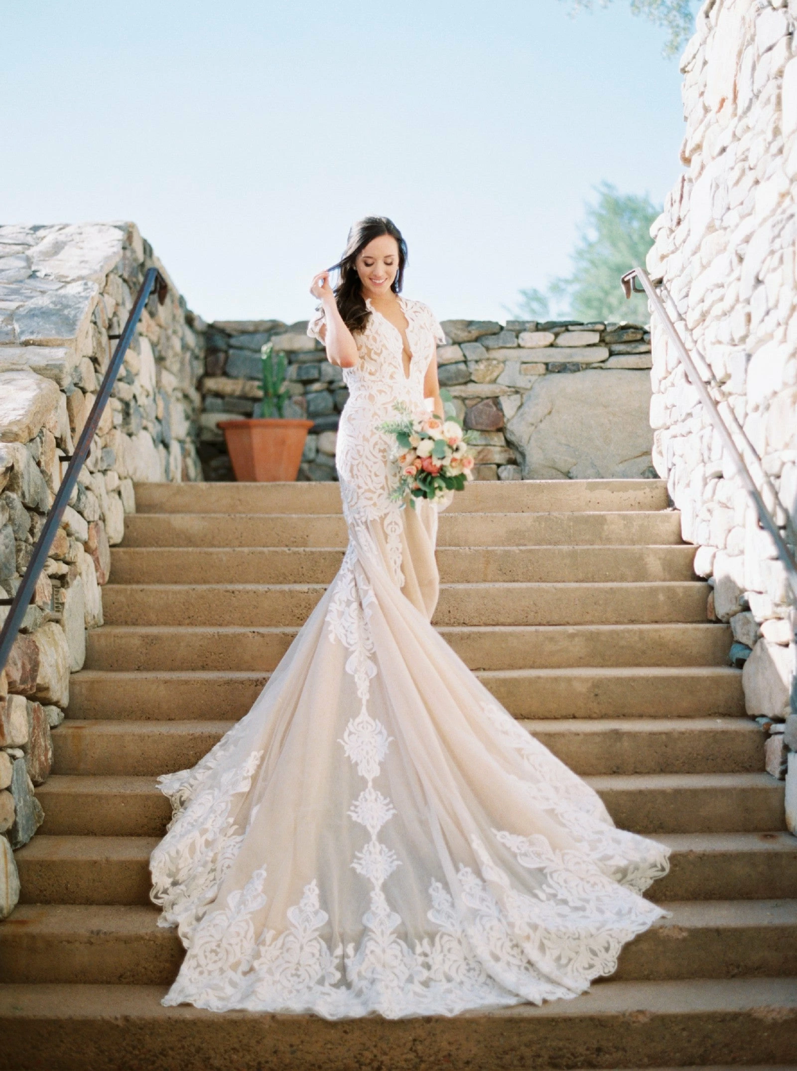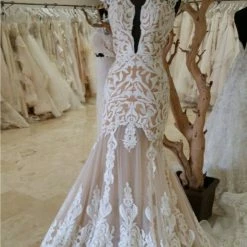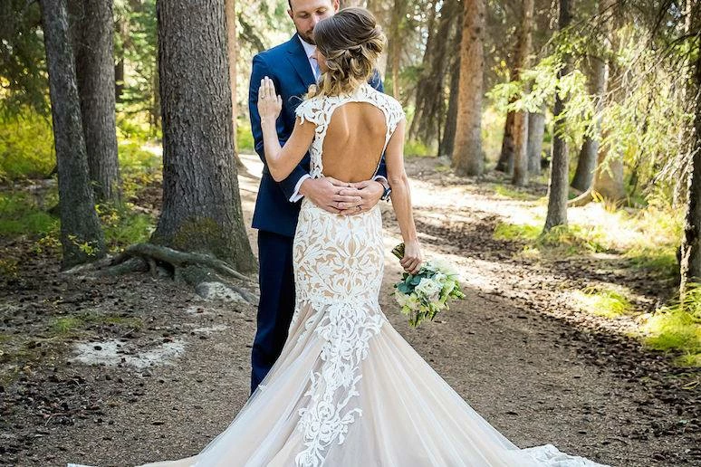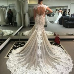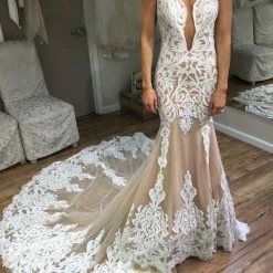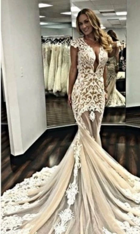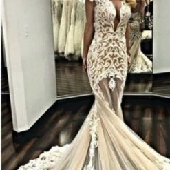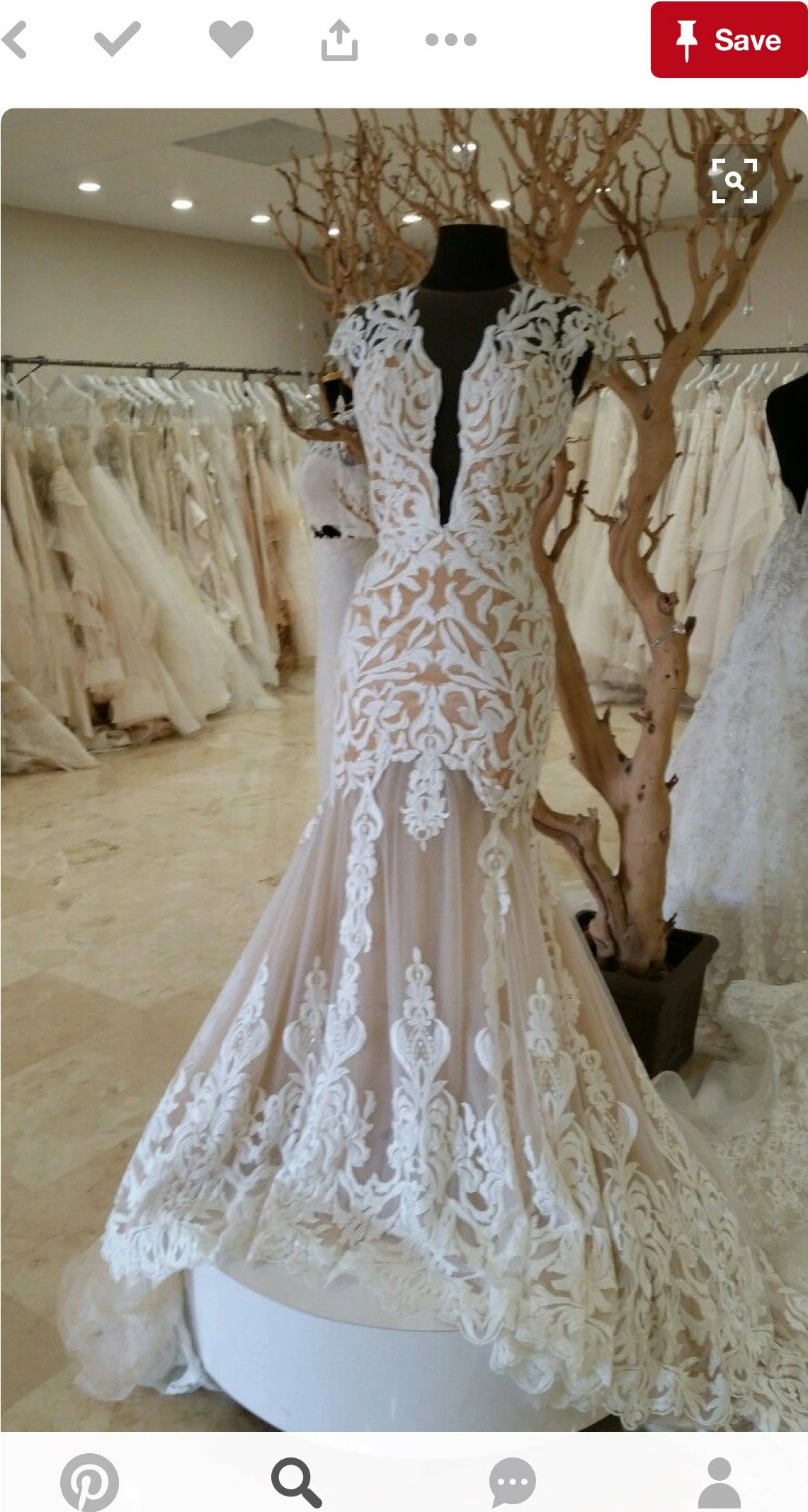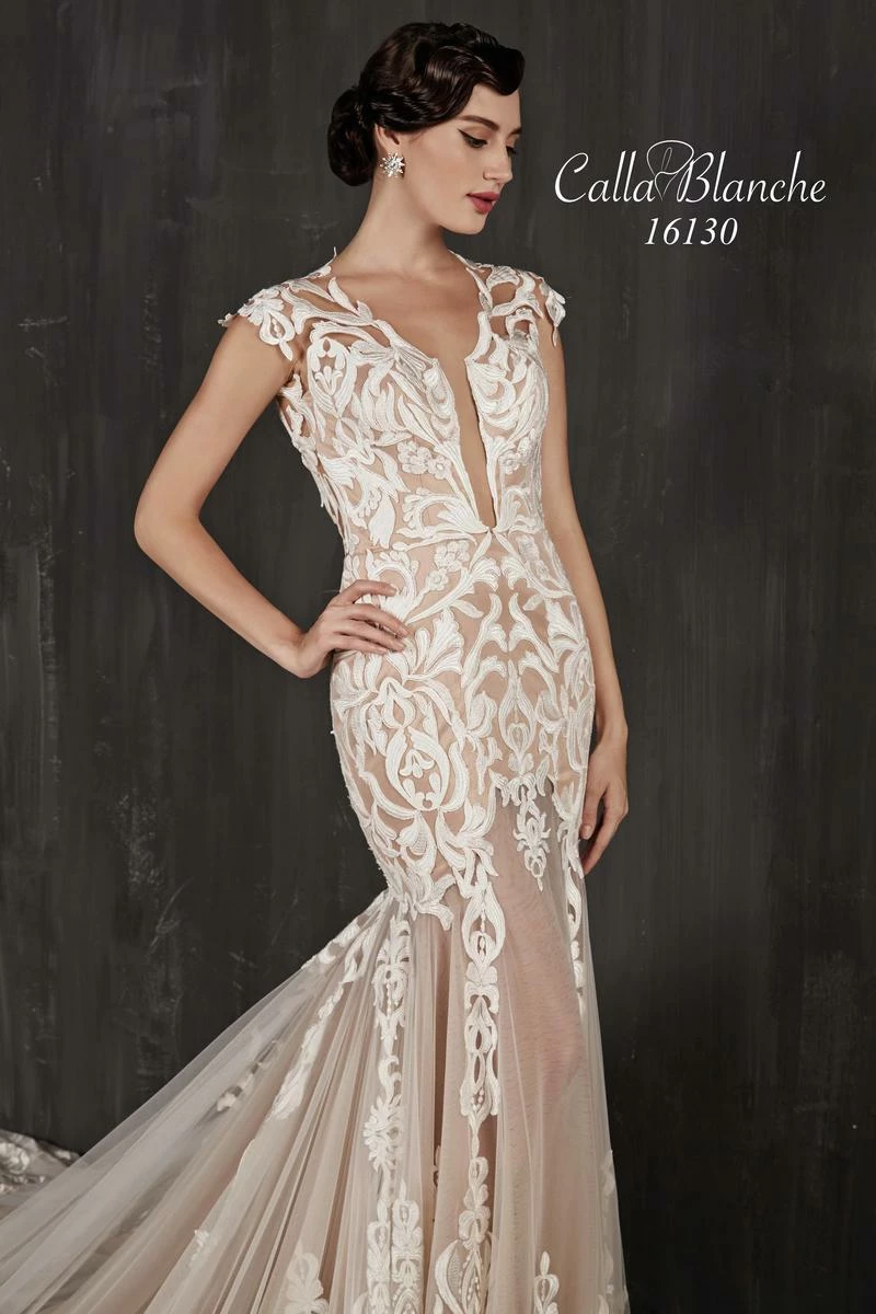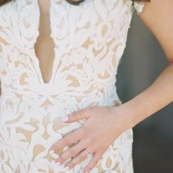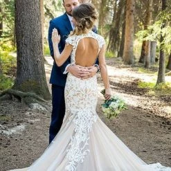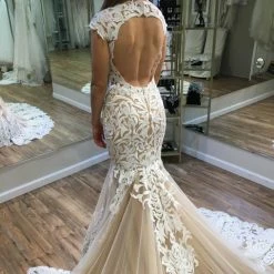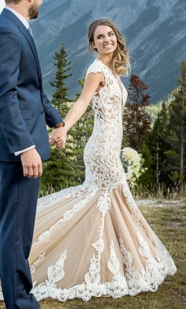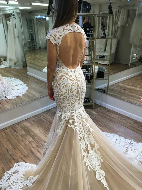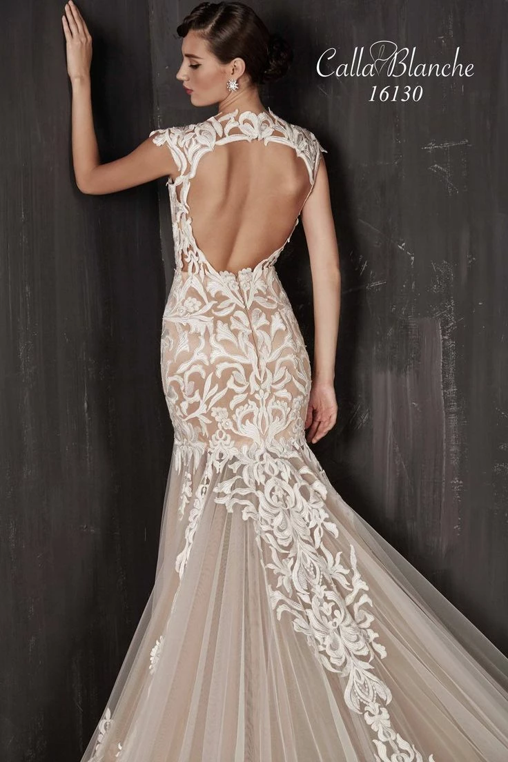 The elegantly placed embroidered lace over tulle accentuates the sheath silhouette with cap sleeves and an open back. It is available in Ivory/Nude.
