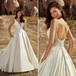 “Vida” V-neck A-line satin wedding dress. Satin gown with beaded applique and a sheer back. Buttons all the way down the cathedral train.Â