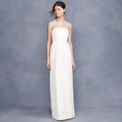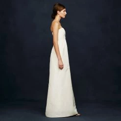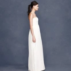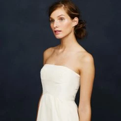 A stunning strapless gown in creamy silk taffeta–it will elevate anything from barefoot beachside nuptials to a big-city affair. Featuring a fitted bodice with an interior corset for added support, a fuller A-line skirt that falls from the natural waist and diagonal seaming details on the bodice.
