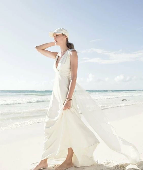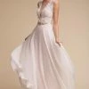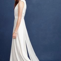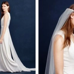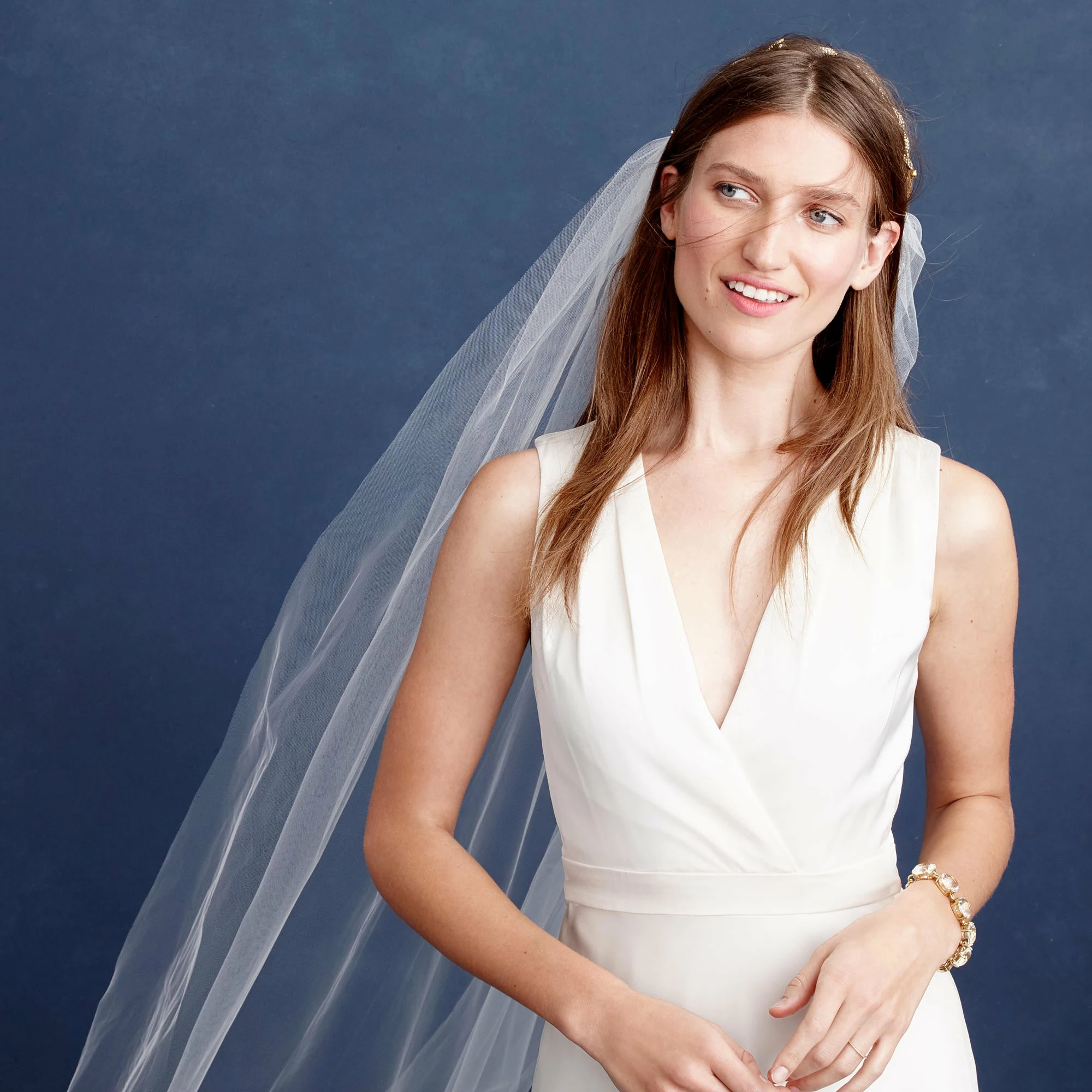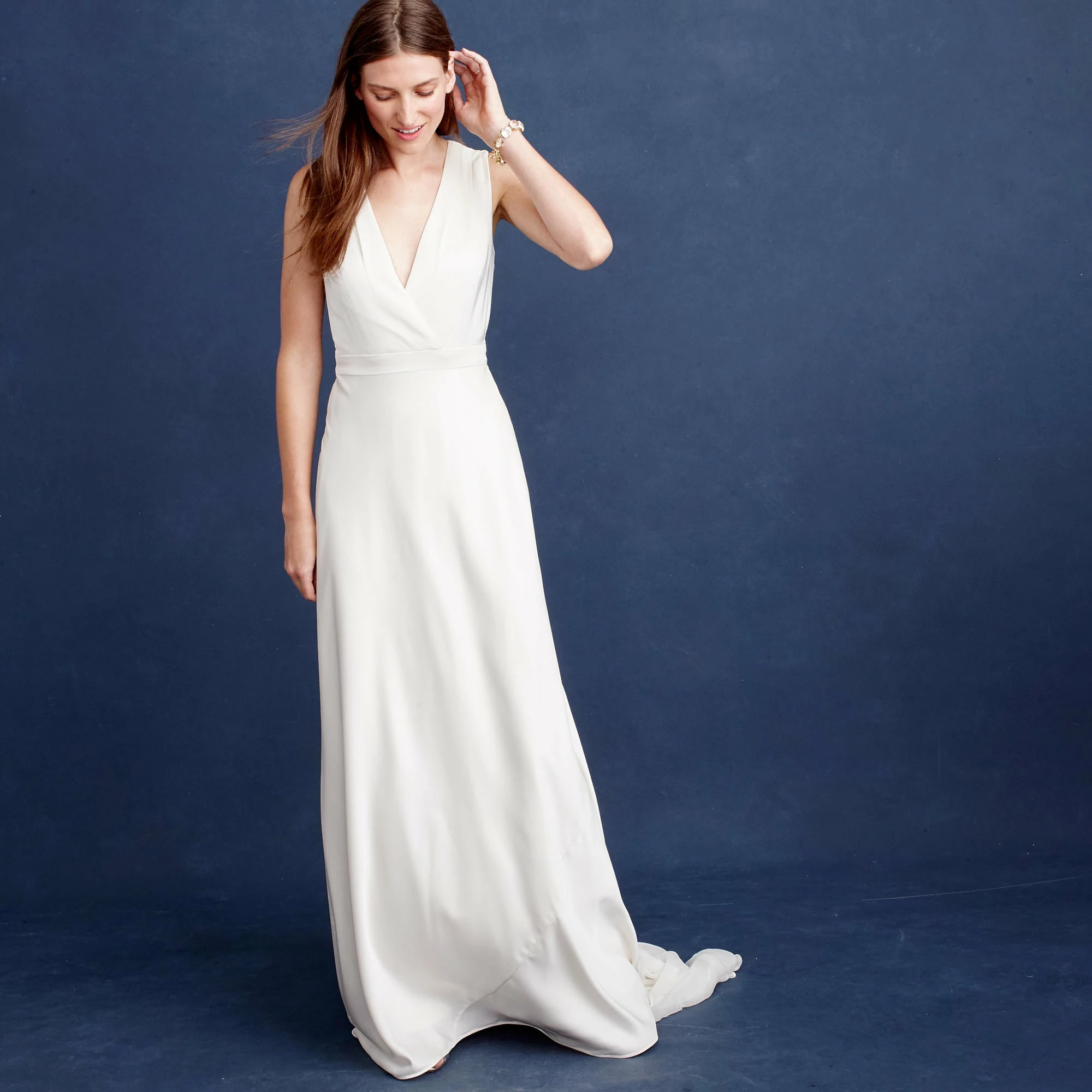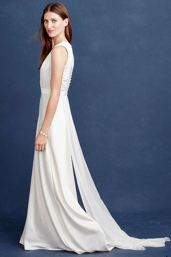J. Crew designers were inspired by the classic minimalist bride when they created this simple and graceful wedding dress. Made from a fabric that drapes beautifully and has just the right amount of lustre—with a pretty trailing chiffon train and covered buttons all down the back. We can pretty much guarantee that you’ll look as good coming as you do going down the aisle.