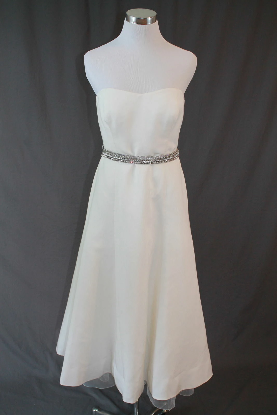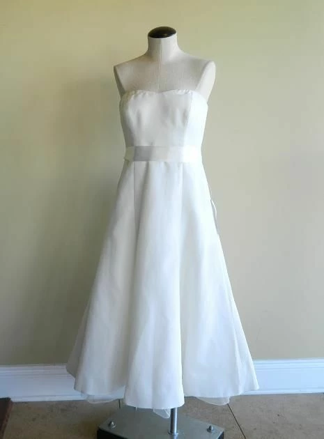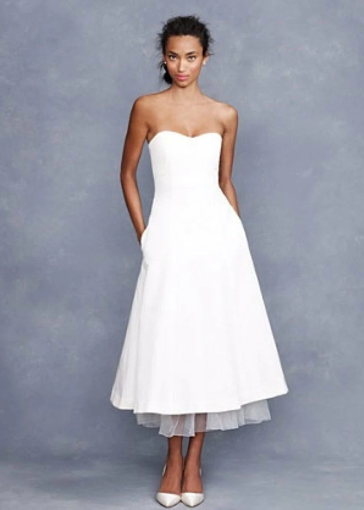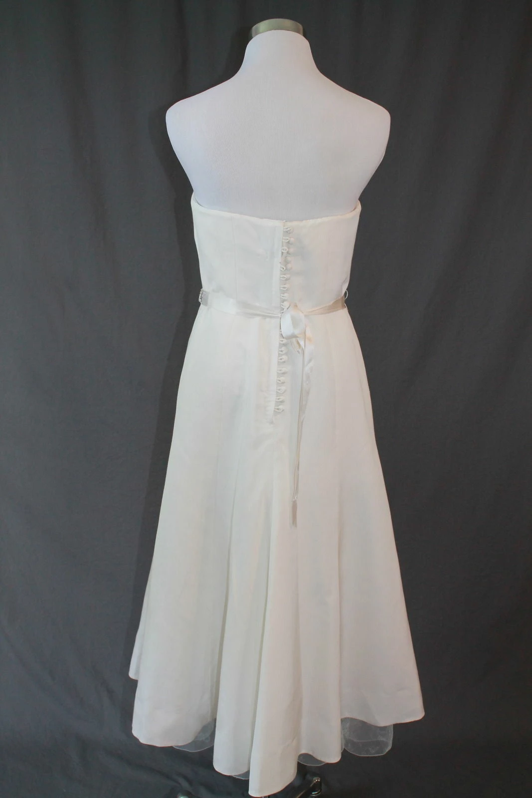 A scene-stealing dress with a ’50s-inspired tea-length hem and a swish-worthy skirt. Astonishingly light in a crisp blend of cotton and silk faille, the strapless A-line silhouette shows off its clean contours and subtle sheen. Finished with exquisite details including picot-edged organza trim peeking out from the hem, a strand of covered buttons down the back zip and an interior corset with flexible boning (so you have all the support you need on your big day).Â
