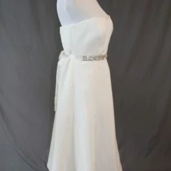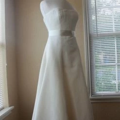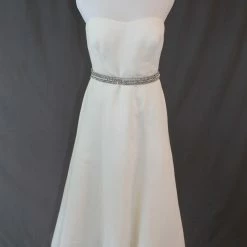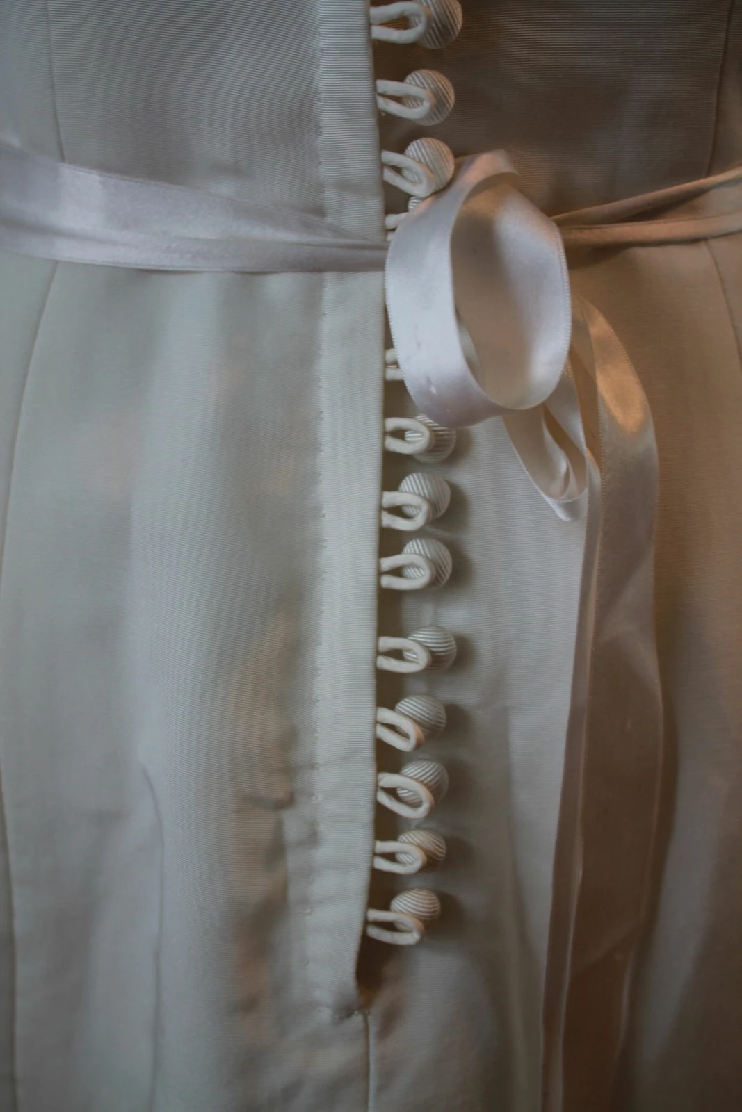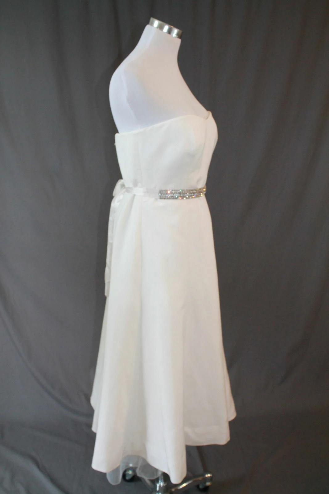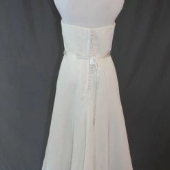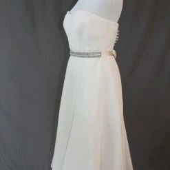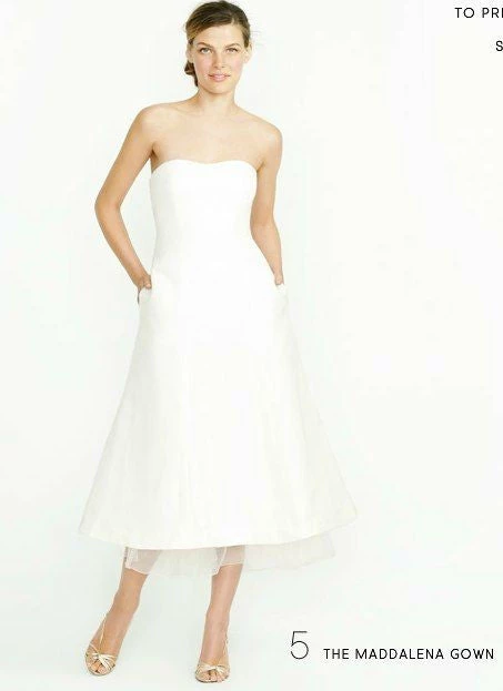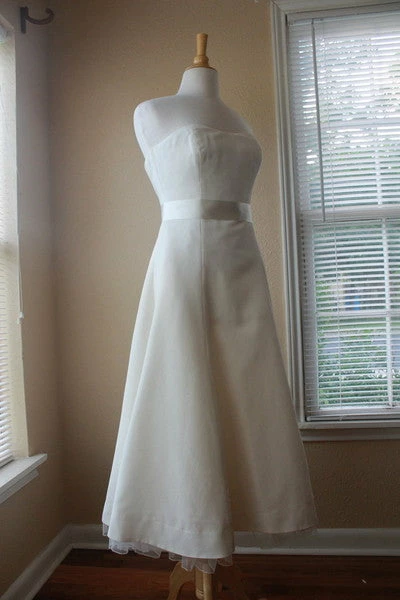A scene-stealing dress with a ’50s-inspired tea-length hem and a swish-worthy skirt. Astonishingly light in a crisp blend of cotton and silk faille, the strapless A-line silhouette shows off its clean contours and subtle sheen. Finished with exquisite details including picot-edged organza trim peeking out from the hem, a strand of covered buttons down the back zip and an interior corset with flexible boning (so you have all the support you need on your big day).Â