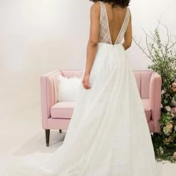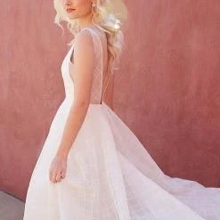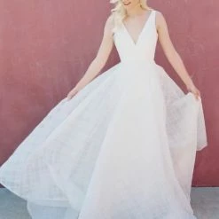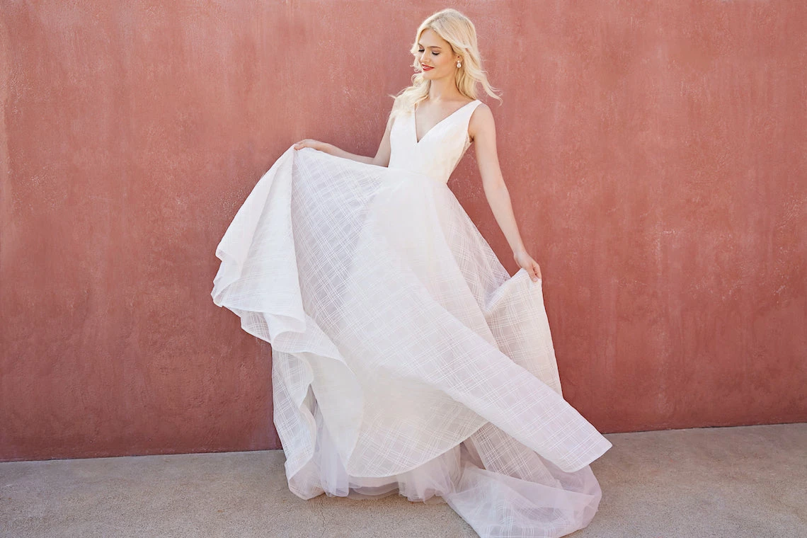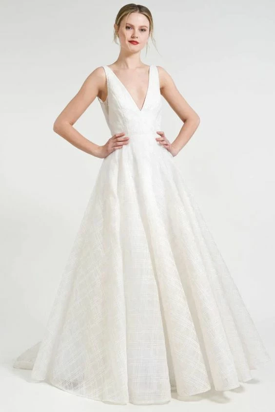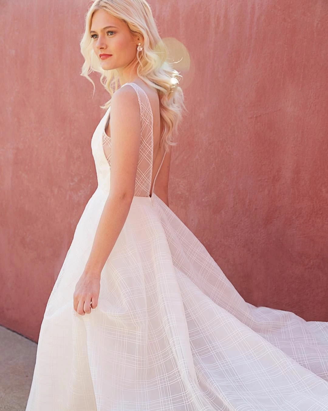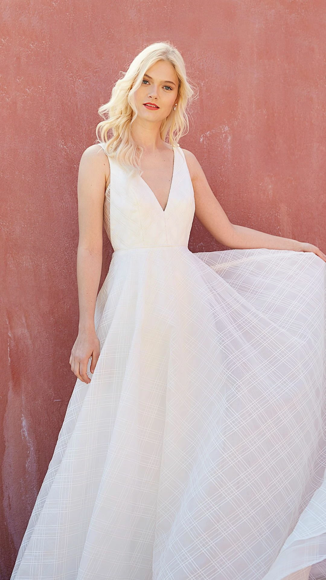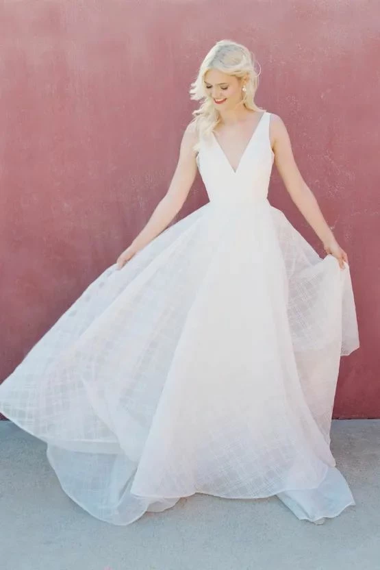 Jenny Yoo Avery is a darling A-line gown! It features a V neckline, low illusion back, and natural waist. Plaid organza gives this classic silhouette a fun, modern twist! This gown comes to us in great condition from a designer boutique.