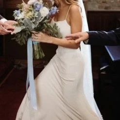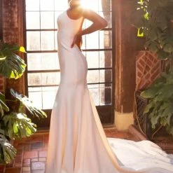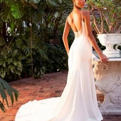 The Eva scoop neck fit and flare bridal gown is deceptively simple. Her clean neckline and delicate spaghetti straps are elevated by the luster of our silk 4 ply crepe and architectural seam details that sculpt an alluring fit and flare silhouette. A plunging scoop back with an illusion inset adds another eye catching element. Covered buttons down the back of the chapel length train finish off the look with a classic bridal detail.