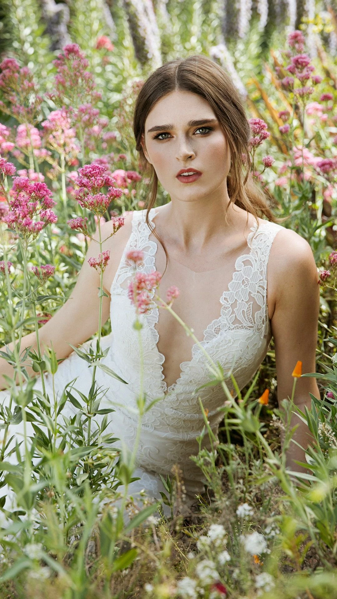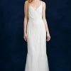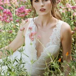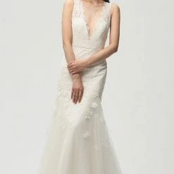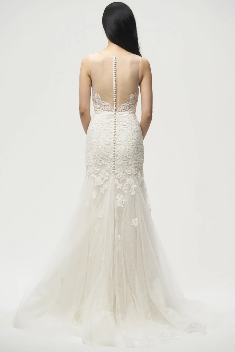 The Rowen gown, part of the ‘Jenny by Jenny Yoo’ Bridal Collection, features scattered lace appliques that provide an ethereal, romantic feel. The plunging V-neckline elongates the neck, while the fit and flare skirt accentuates the figure. The sheer illusion back with covered buttons adds a traditional touch. This elegant wedding dress is fully lined with a center back zipper.