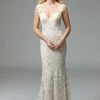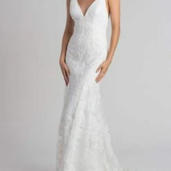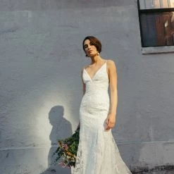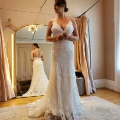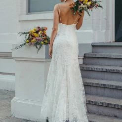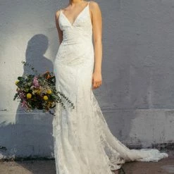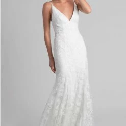 The Tensley lace V-neck spaghetti strap fit and flare bridal gown is as effortless as she is romantic. Gorgeous floral embroidered tulle gives this gown a bold yet delicate texture. The V-neck tapers up into delicate spaghetti straps that flatter your shoulders and collarbone, and all but disappear at the back for a barely there feeling. The sultry fit and flare silhouette releases into godets at the hem for dramatic fullness and movement. A back flounce seam gives way to a chapel length train left sheer to appreciate the detail of the floral embroidery.
