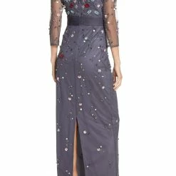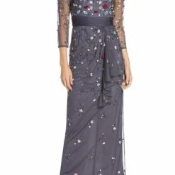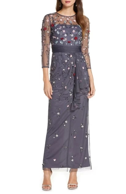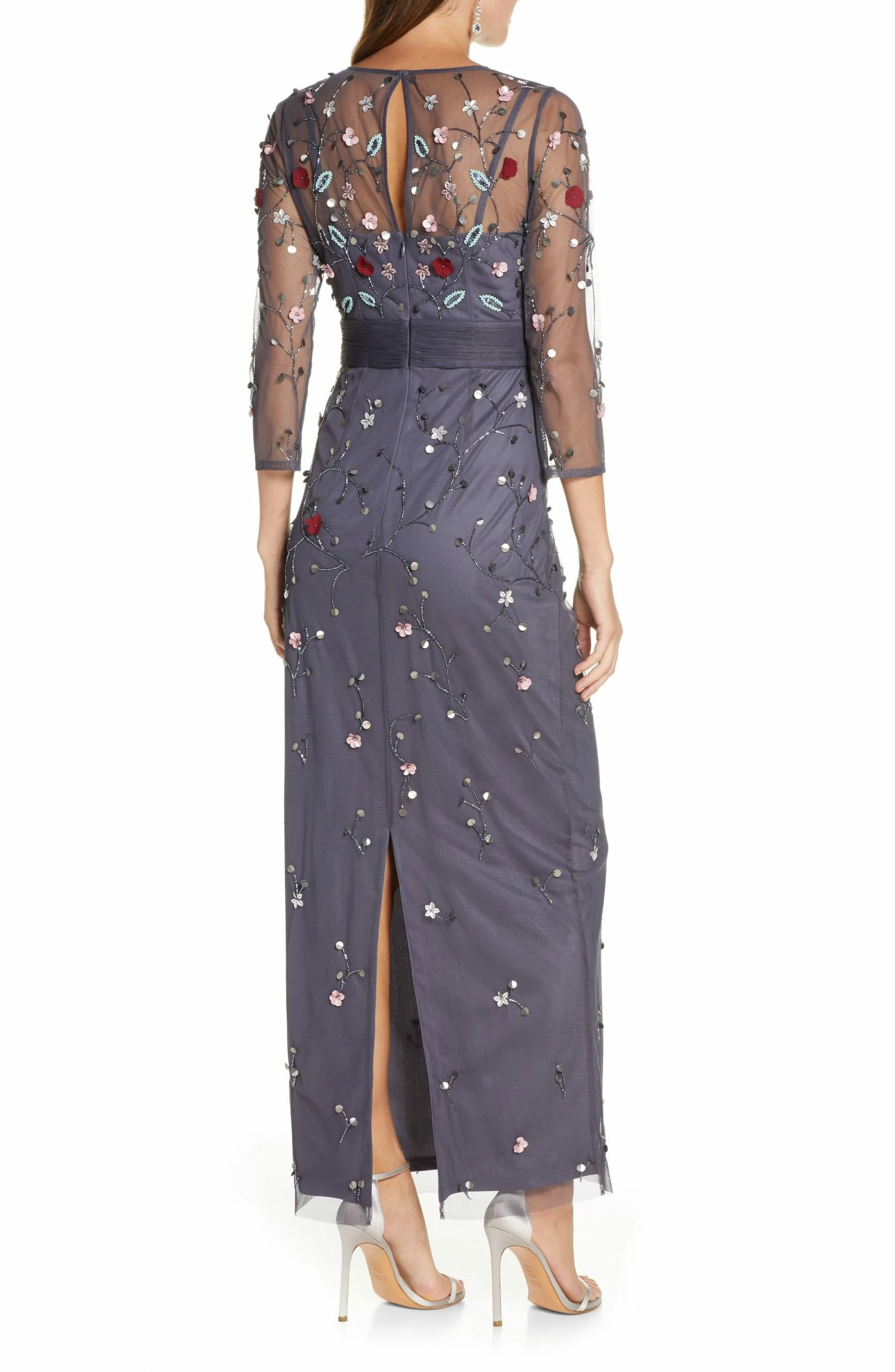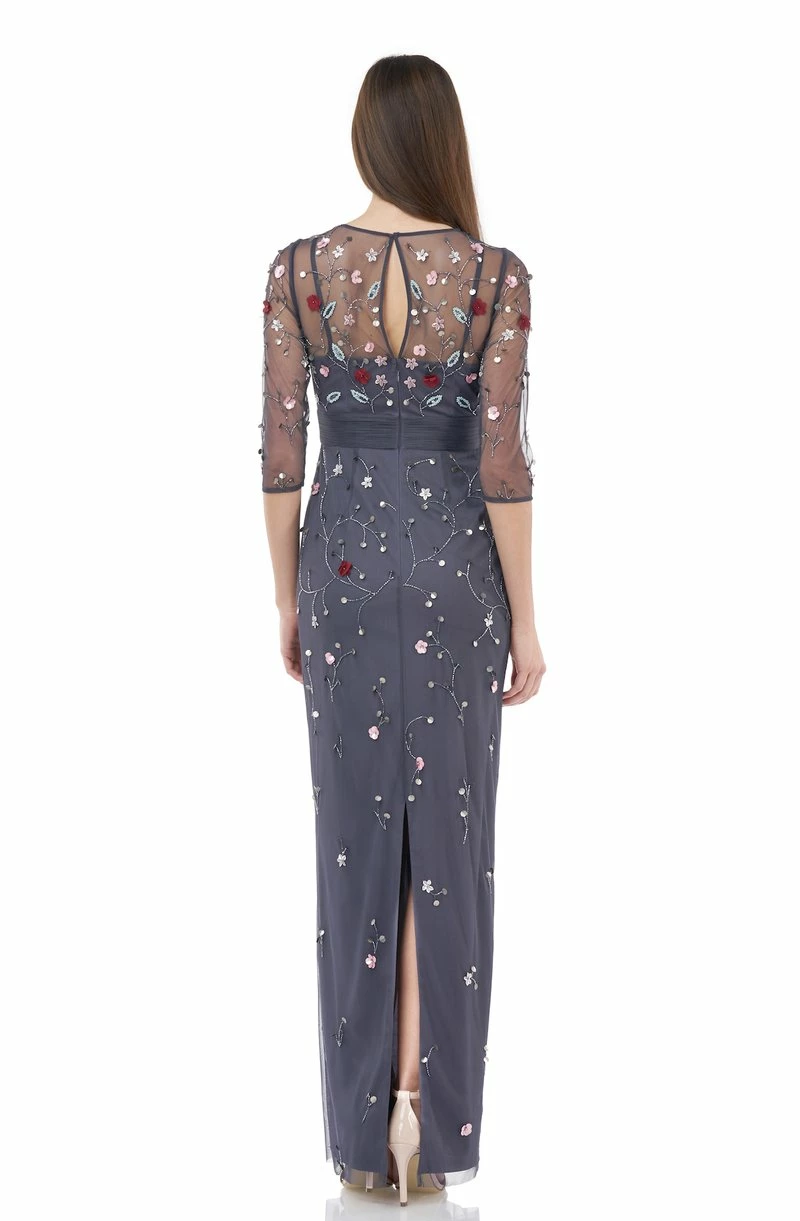 Bloom brightly with every entrance in this mesh gown backed by a satiny sleeveless lining and detailed in three-dimensional wildflowers. 3/4 sleeve, illusion gown features floral beaded detailing and front drape.Â