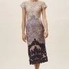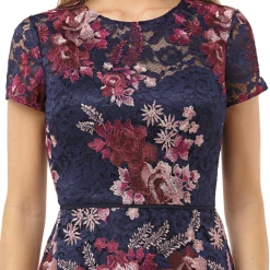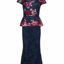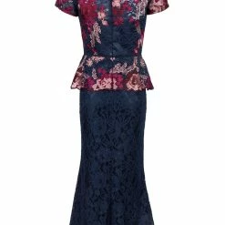 A multicolored embroidered bodice—paired with a slim skirt trailing a floor-pooling train—brings two-piece illusion to a flattering lace evening gown.