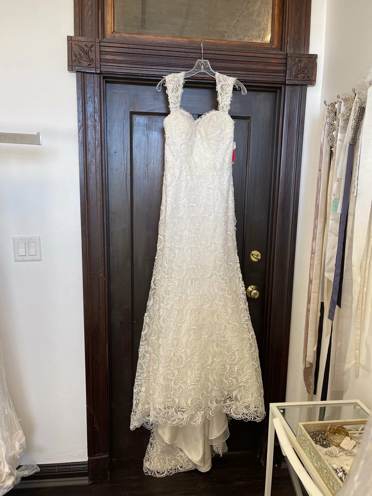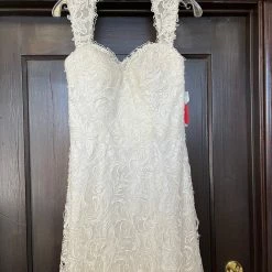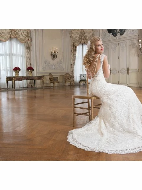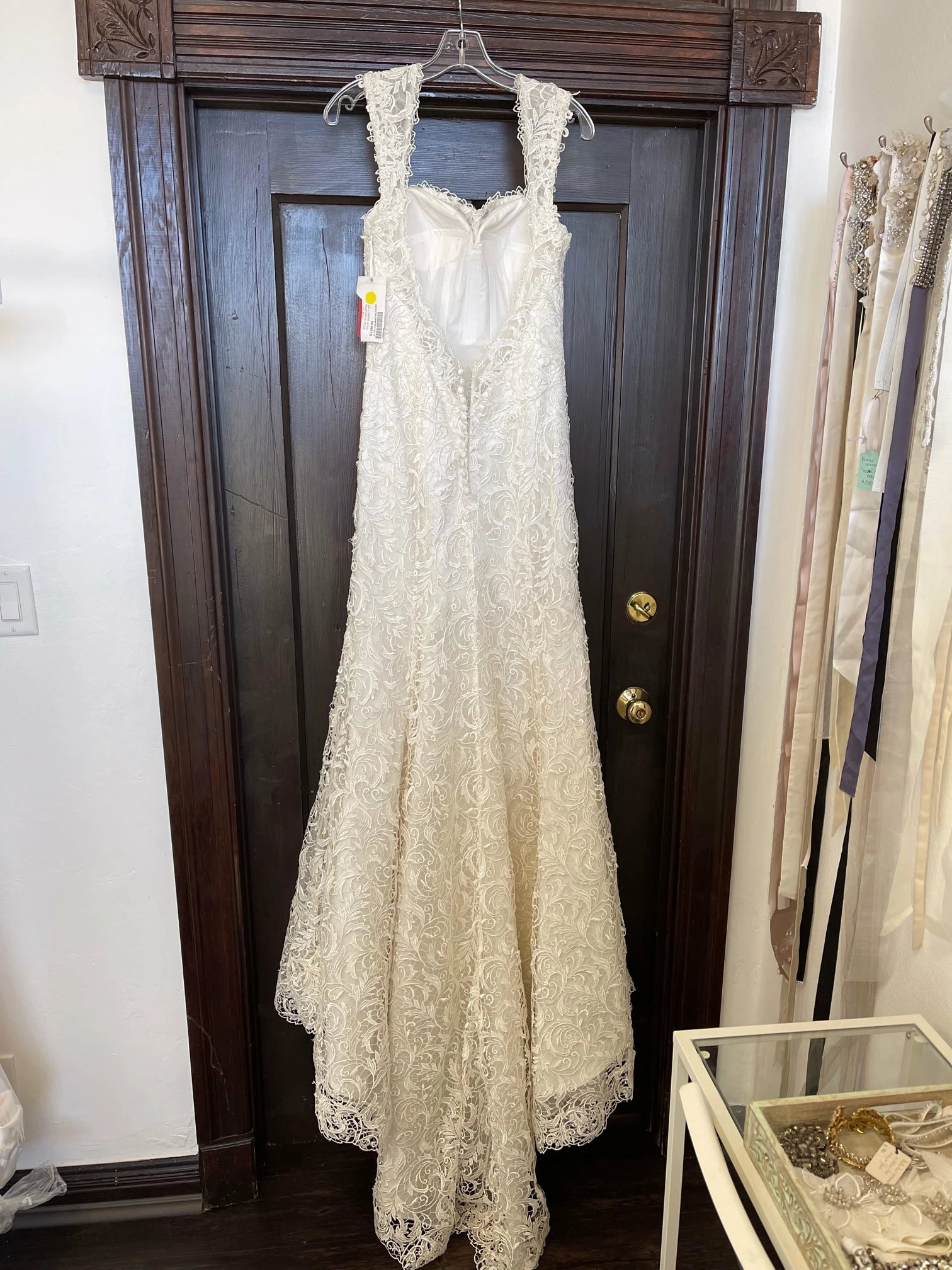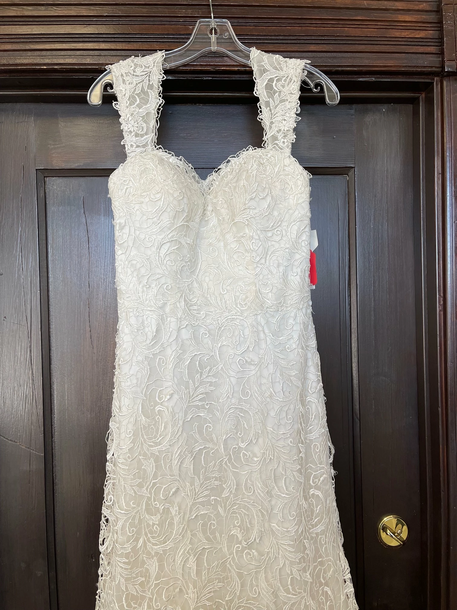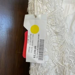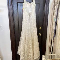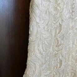 CONDITION: This dress was a store sample. There is very light amounts of dirt along the hemline and professional cleaning is at your discretion.  There is light wear on the lace and a few imperfections. One small tear in the lace on the hip area (see picture of actual dress). It can easily be stitched up by a seamstress.  Price reflects the current condition of the gown.  Overall, the dress is in very good condition. Â