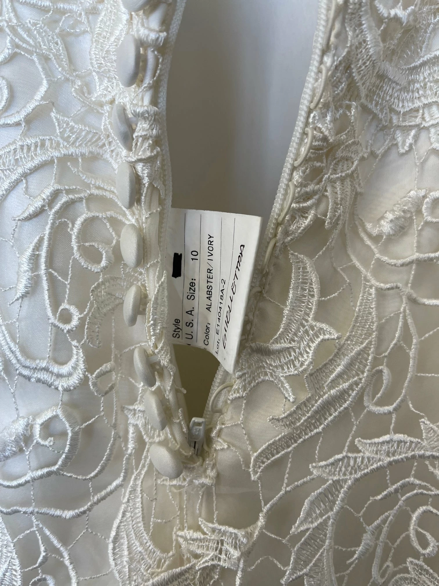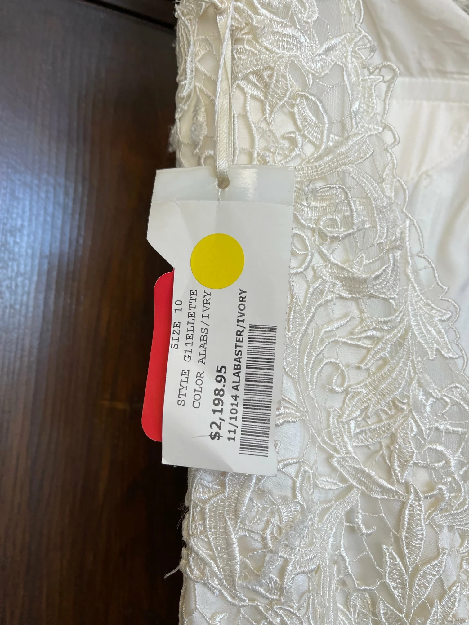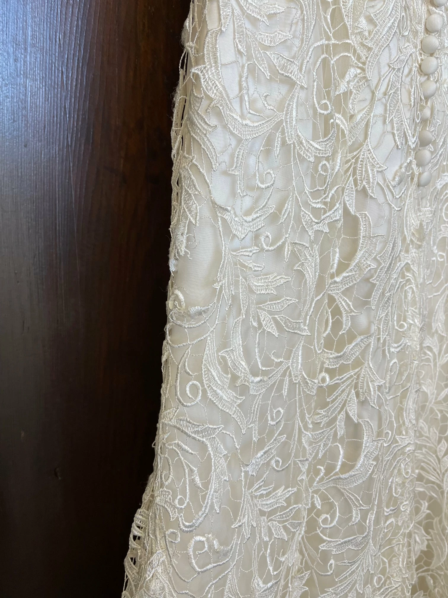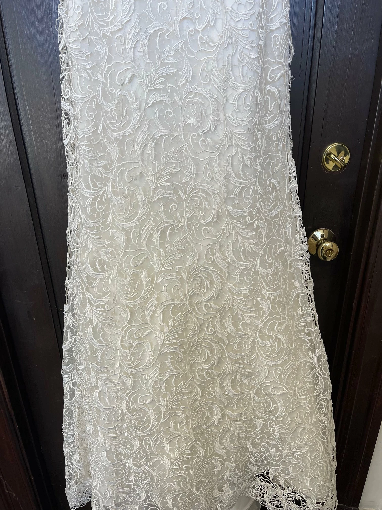 CONDITION: This dress was a store sample. There is very light amounts of dirt along the hemline and professional cleaning is at your discretion.  There is light wear on the lace and a few imperfections. One small tear in the lace on the hip area (see picture of actual dress). It can easily be stitched up by a seamstress.  Price reflects the current condition of the gown.  Overall, the dress is in very good condition. Â