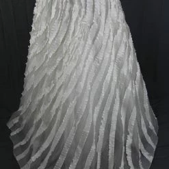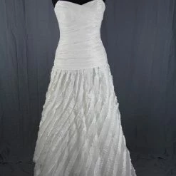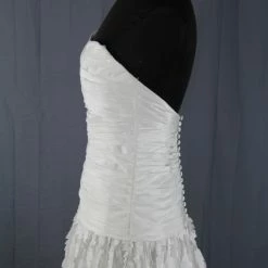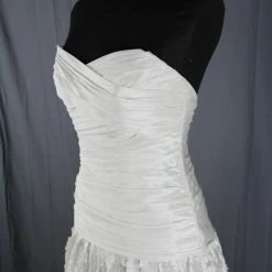 Silk taffeta shirred drop-waist strapless A-line gown with spiral stitched taffeta ruffle detail on orgranza skirt in white.