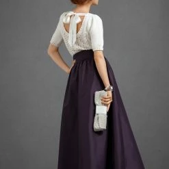 Silk taffeta shirred drop-waist strapless A-line gown with spiral stitched taffeta ruffle detail on orgranza skirt in white.