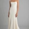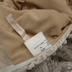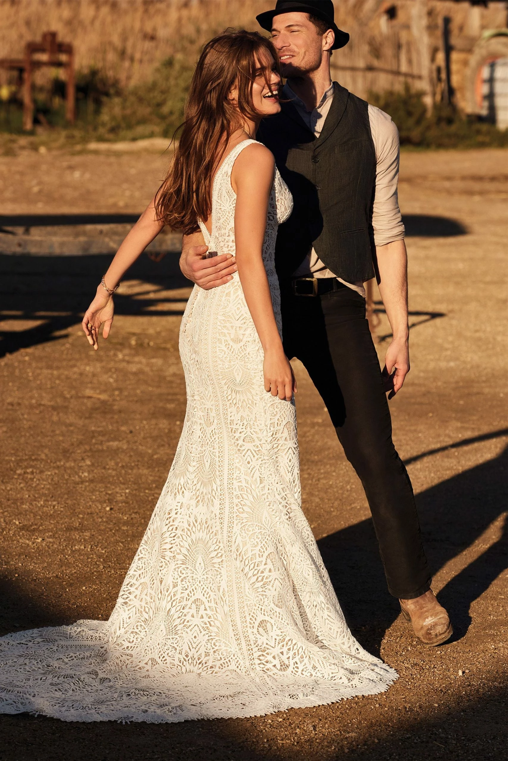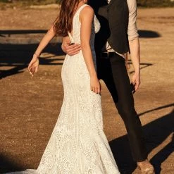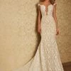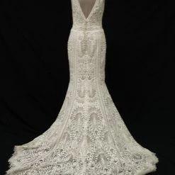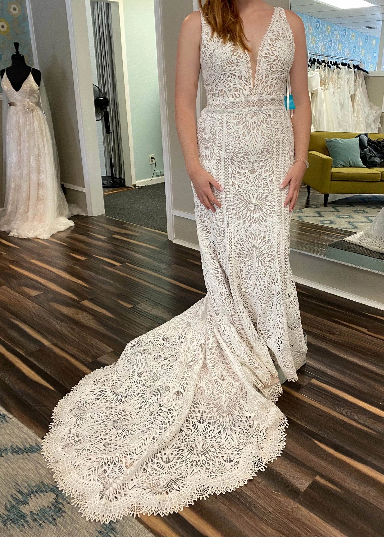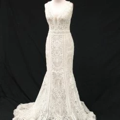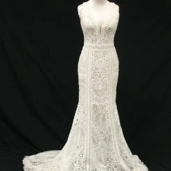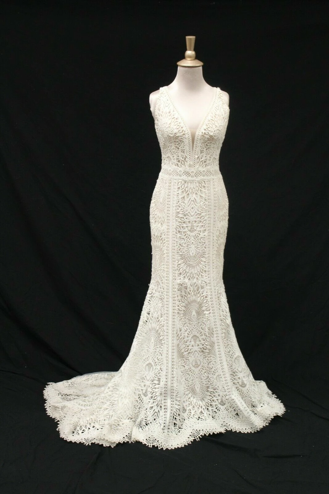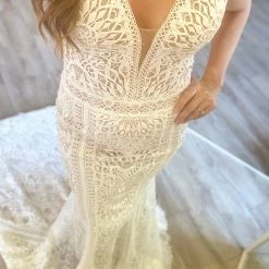 Be remembered in this sexy fit and flare wedding dress. The allover geometric lace creates a unique look while the shapewear mesh lining gives you a flawless shape. Details include a small plunging neckline, lace trim at the natural waist, and scalloped hem lace.