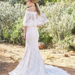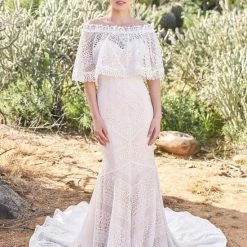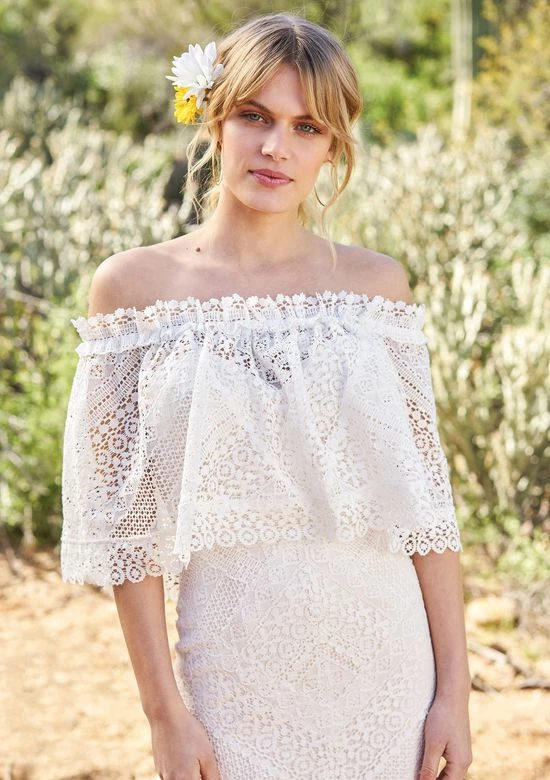 Crocheted geometric patterned detachable stretch off the shoulder cape.