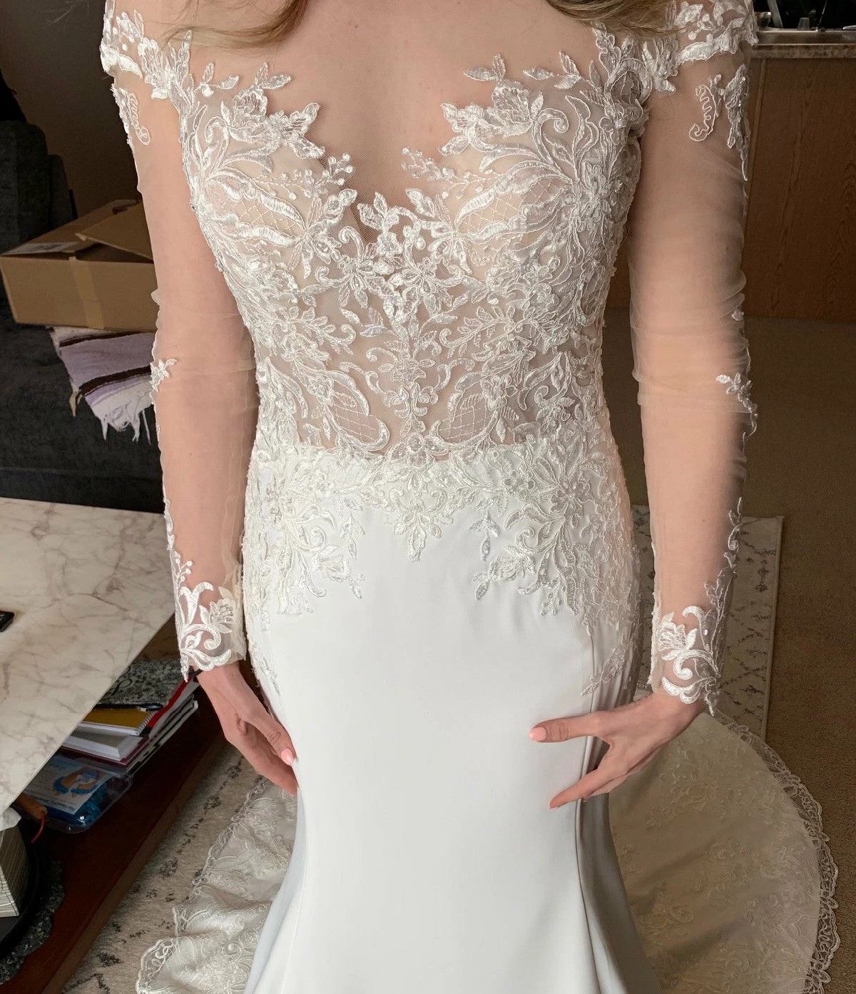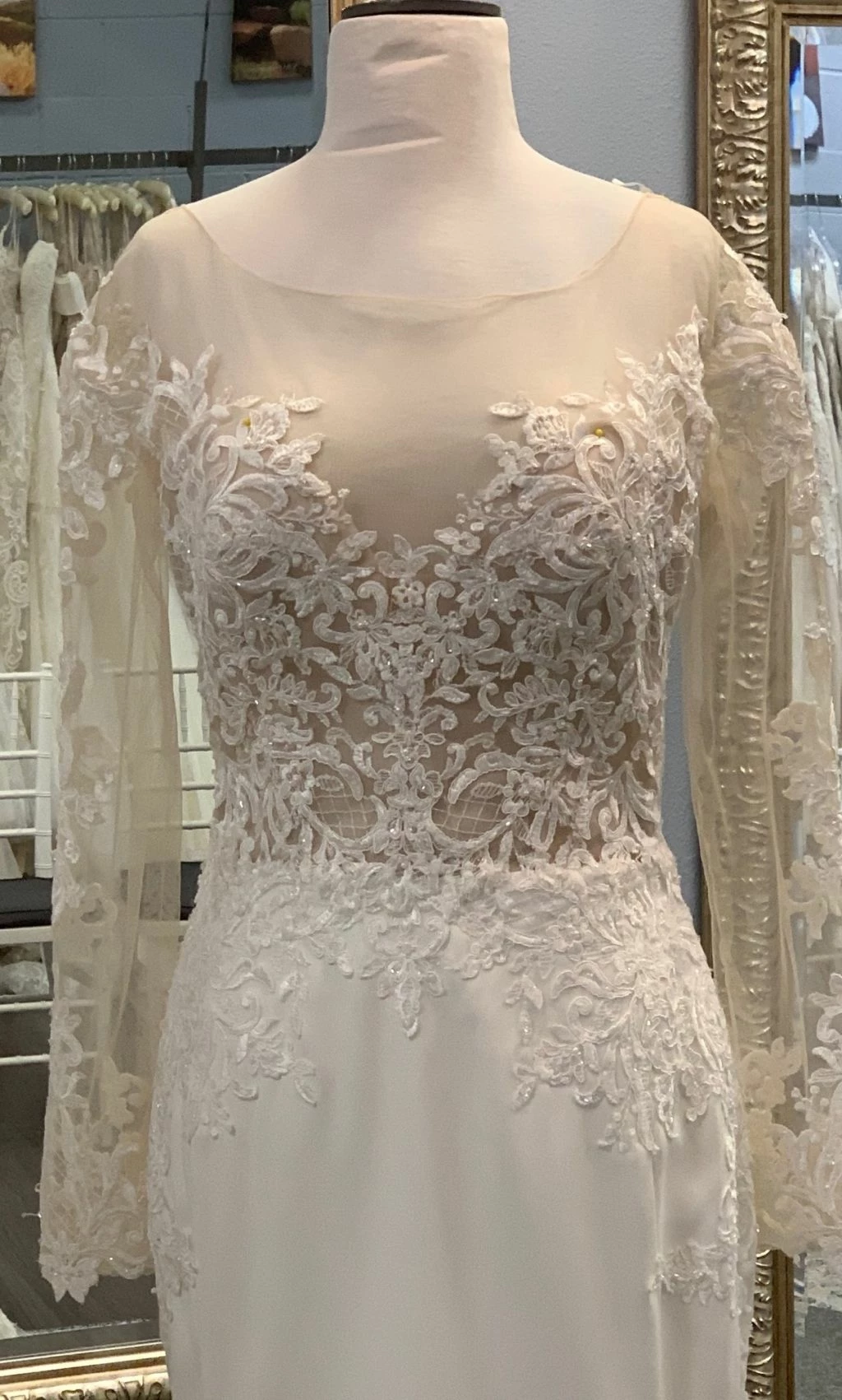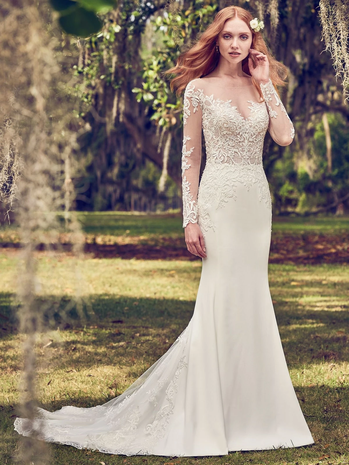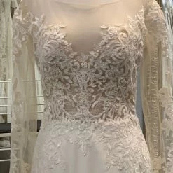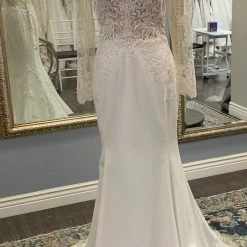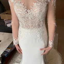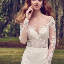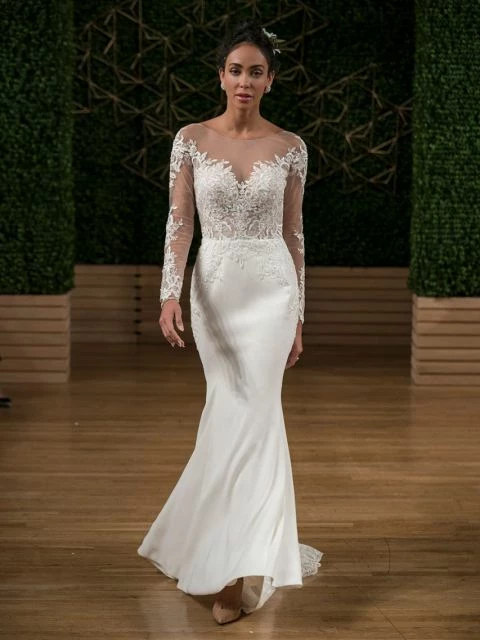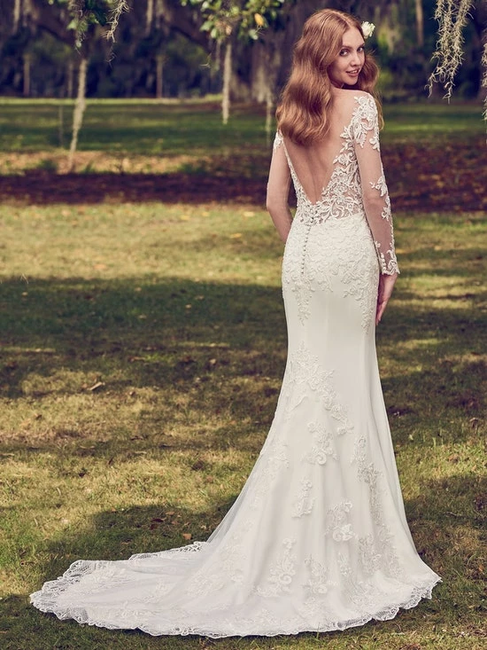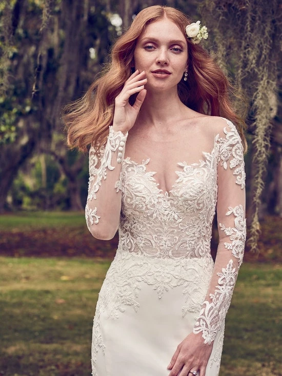 This Yolivia Crepe fit-and-flare features an illusion nude bodice, illusion portrait neckline, and illusion long sleeves, all embellished in beaded lace motifs. An illusion V-back accented in lace motifs complete this sleeved wedding dress. Finished with covered buttons over zipper closure. By Maggie Sottero.