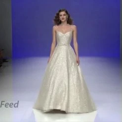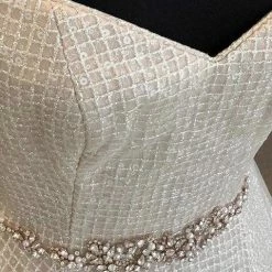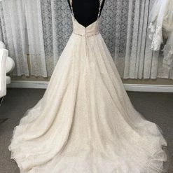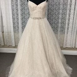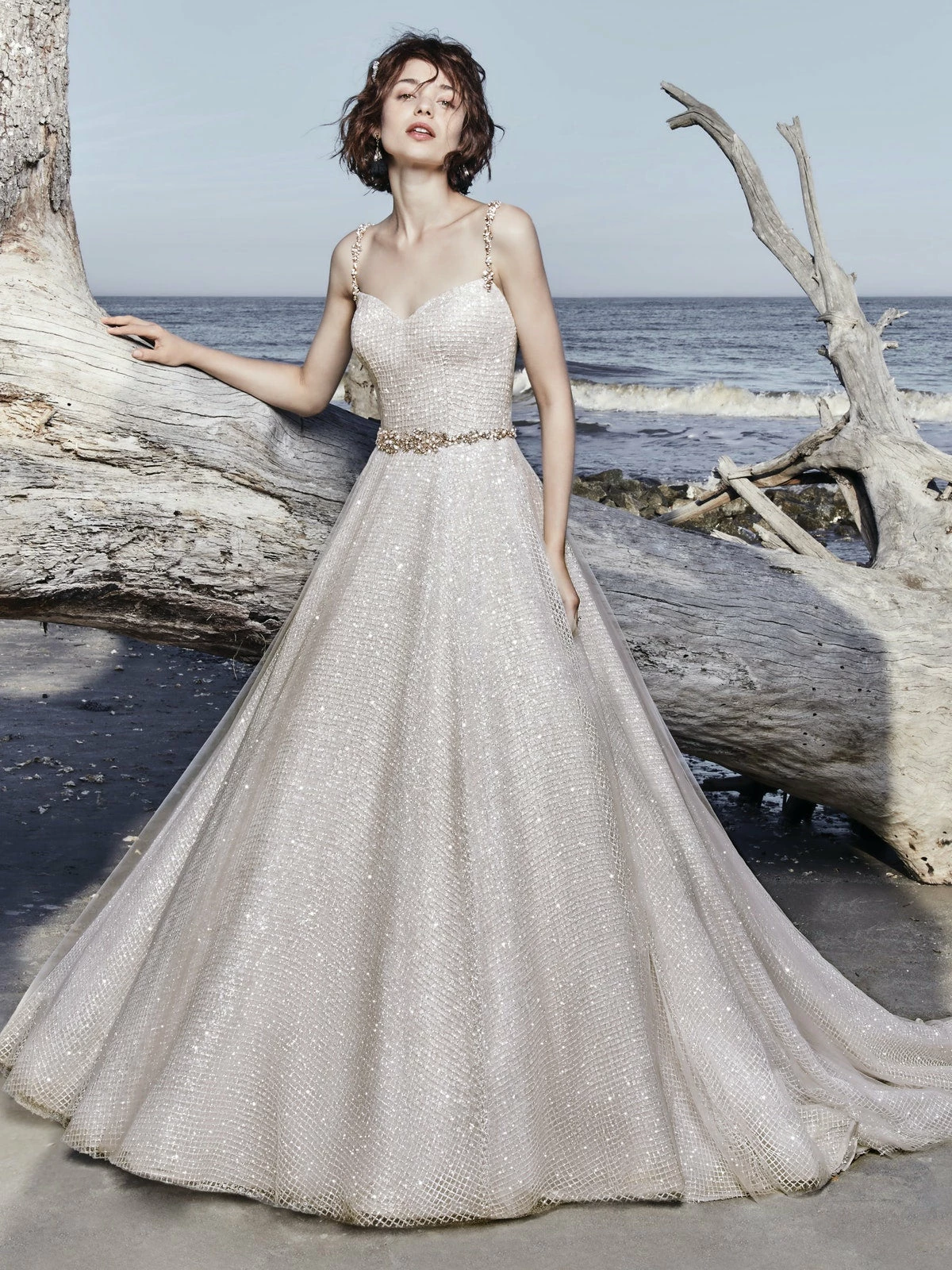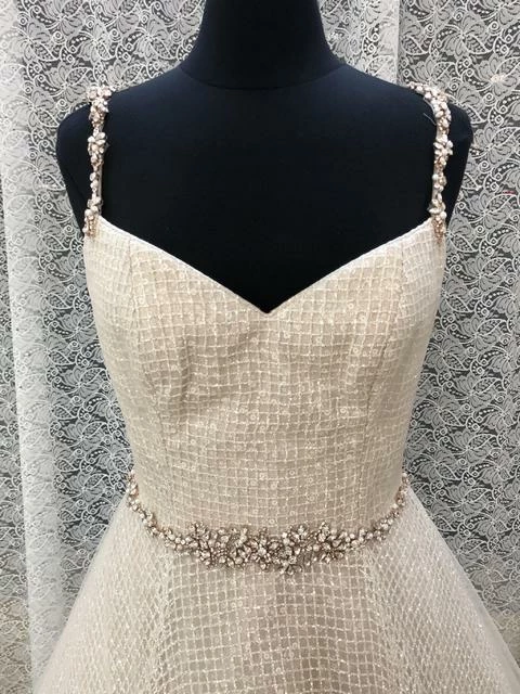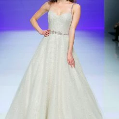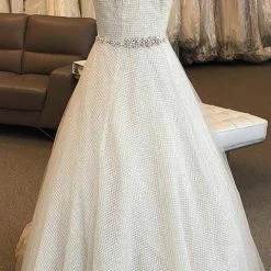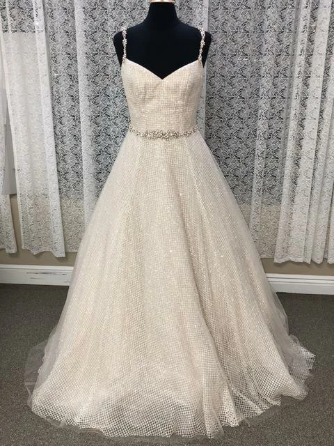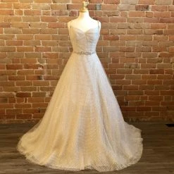 Channeling glamour and sophistication, this modern princess ballgown features a shimmering crosshatch tulle. Swarovski crystals accent the attached beaded belt and spaghetti straps, complementing the subtle sweetheart neckline and V-back. Finished with crystal buttons over zipper closure. This unique, shimmering and whimsical ballgown catches light from all angles!