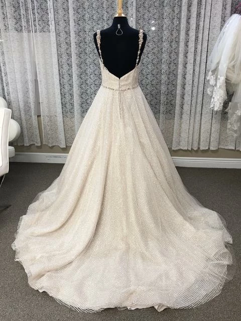 Size 12. Sample gown, but in like new condition. Has been tried on in store, but has no noticeable signs of wear. Never worn outside the salon and never altered. This gown is absolutely stunning! Retail price: $3,699!