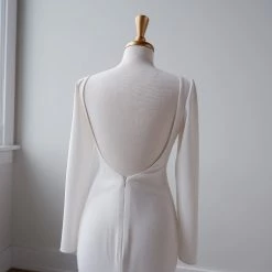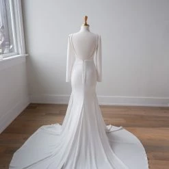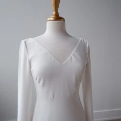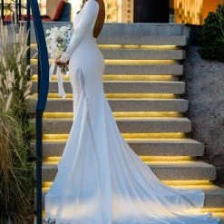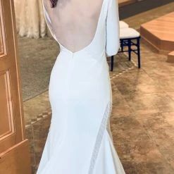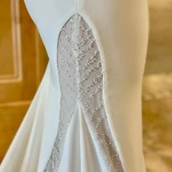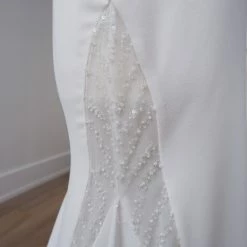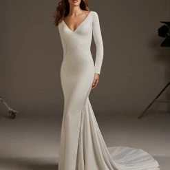 ‘Bianca’ by Pronovias is a truly exquisite gown, with beaded piping down the side seams and fitted long sleeves in soft crepe. Crepe dress with V-neck, long sleeves, deep back, and beaded piping on skirt.  Embellished insets will shine on the skirt of this figure-skimming gown as you swish down the aisle.